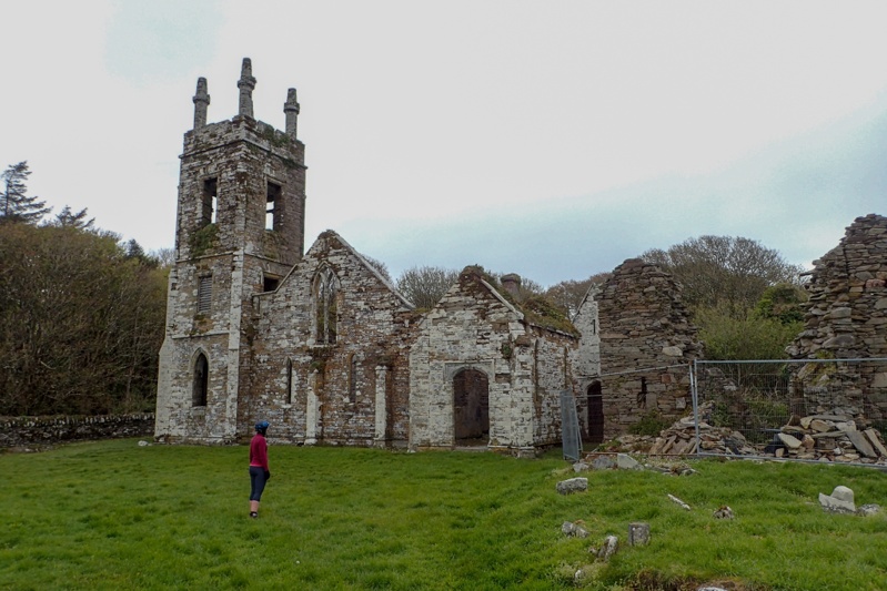 We knew that there would be rain showers about today but it was just a little overcast when we set out and certainly warmer than yesterday. We stopped after a few kilometers at Clonakilty to pick up something for brunch. As it was just after 08:00 everything was shut bar a bakery but we got something good there. Clonakilty is a well known town, by me for their black pudding. Although I love black and white pudding, after eating it more or less every day since arriving in Ireland, I think I have had my fill for a bit! I confess to not knowing much about the birth of Ireland as a Republic beyond a few detaiils, but this south west area seems to have been very active politically and some famous names like Michael Collins feature. Mike had found a beautiful spot on the GPS for tea just at Rathbarry. We turned off the main road and into the woods of Castlefreke. There was a picnic area and trees with leaves of the most amazing bright green all lacey in the morning light and banks of bluebells. A lady came for her morning walk and had a chat to us. The thing about Irish people is that they always seems genuinely thrilled to see you and are absolutely engaged when they talk to you. There is no air of social etiquette or forced politeness, they are interested in one another. Our route was supposed to contune past the castle, but the road was closed due to roadworks. We tried to follow along a walking track which did not help us, but did bring us out at a wonderful ruined Abbey which was interesting. In the end we abandoned the road and went back to the main road. We do however haate to back-track, but sometimes it can't be helped.