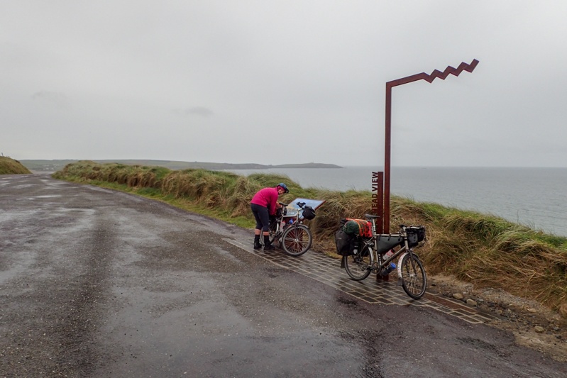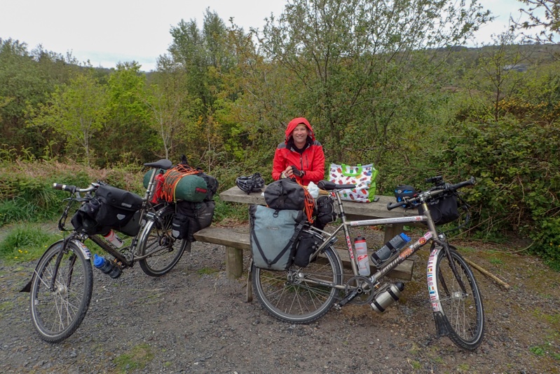 The rain came in around midnight. We got up and got going as usual, packing up the tent, and the bikes in pouring rain. We weren't really upset by the weather. It is Ireland after all and this is day 7 of bad weather for us so we are bound to hit a good streak sometime soon! On our bikes by 08:00 we stopped to buy lunch makings at Dungarvan Spar. Then the route tweaking started. Mike plans the route with a purist approach, but if the day presents itself and it makes sense to try another option, we make the change on the fly, especially if the weather is crapola. So we stuck to a busier B road to start. When I say busy, I mean a normal road that you would find joining two small villages. These sorts of roads though are always better graded and never go over the highest point using farm tracks. They were still cycle routes, so safe to ride. We stopped for our flask coffee and a bun in a children's playpark (no children but a bench was available) and then decided to continue on this route and then rejoin our route later on.