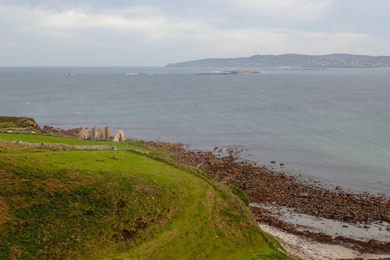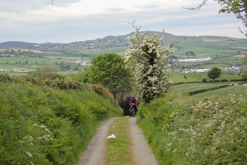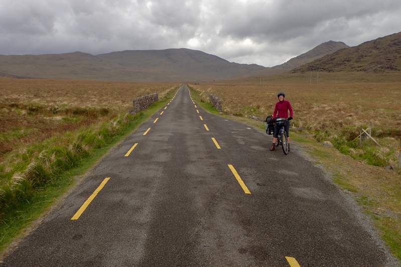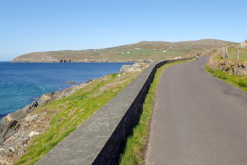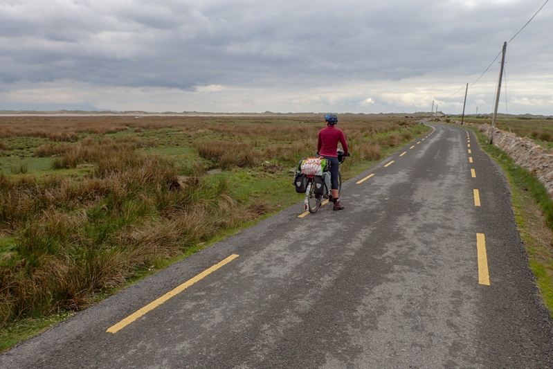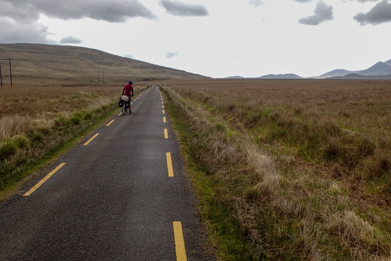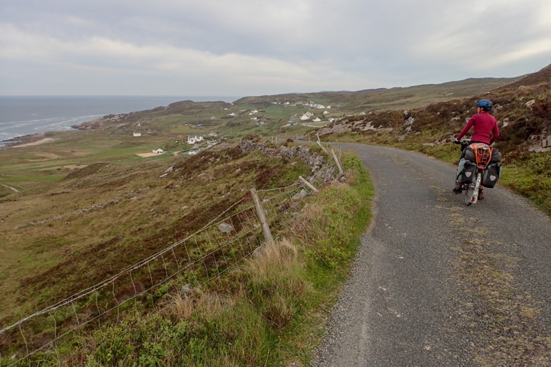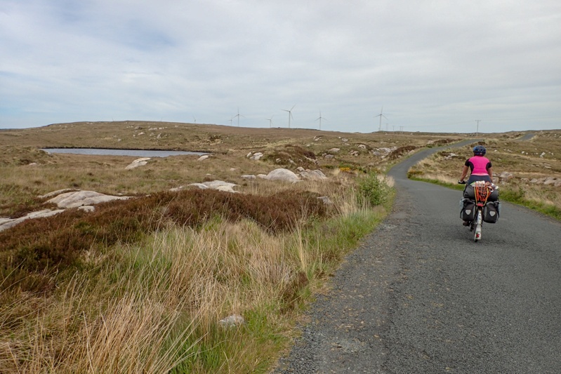 Beautiful views of the bog landscape as we dropped down to the National Park Visitor's Centre. We had some climbing through rural landscape and then shot straight down to Letterkenny where we shopped for food. After this our route took us on some crazy cycleway roads. The cycle route here is called the Donegal Way and we stopped to read the information board about it. They say that they choose level 2 and 3 county roads and are looking at expanding the route. We think it would be a better idea if they just stuck the cycleway on the National Road instead of looking all over for more challenging prospects. Shouldn't be unfair here as clearly if you are only going to do a 200 km cycle tour then you want the views of the farm landscape. We prefer to mix it up a bit.