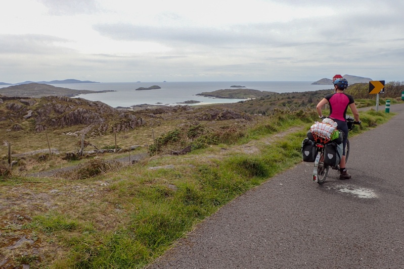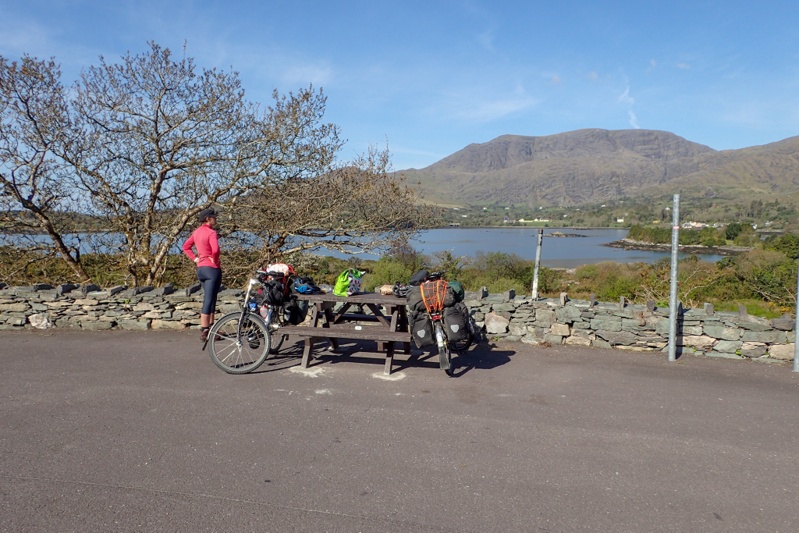 We stopped briefly at Sneem which is a pretty village, very much the tourist drawcard. I chatted to the lady in the info centre about the route. She told me that between 14:00 and 16:00, 20 tour buses come along the road which creates something of a traffic backlog for the cars that sit behind. This gave us added motivation to get on with the ride and get off the road! The route improved after this, a couple of climbs, beautiful coastal scenery. At one point we past a sign at a pub claiming this to be the most famous view in Ireland? Certainly it seems to be the most frequented. The road was busy as people were packing up after the long weekend. We had picked a bush camp option along the Ring of Kerry Walking track just near a view site. This meant filling up with water and also filling a water bag for showering. We found a fast flowing stream on a farming property with gate access from the road and collected the water we needed about 3km before our campsite. It was windy and cold when we arrived but the wind has dropped completely now. We should have a quiet night.