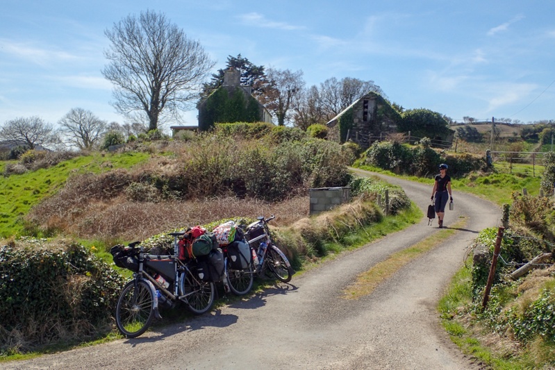 The day passed fairly quickly and before long we were shopping again for the evening meal just before Ballyshannon. As we were aiming for a bush camp along the coast we needed to fill up with water for showering and drinking. From just after Ballyshannon we were looking for options eg. tap at Community Building or graveyard, stream running near road, etc. Then Mike spotted a sign for historic point of interest Abbey and Water Wheels. It was down a hill but off we went and there was a beautiful stream flowing through the Abbey grounds with a water wheel mill. We filtered nearly 10L which Mike strapped to the back of his bike and we were off to complete our last 17km. I carried all the food we had bought so between us we looked like pack animals. A donkey would have come in handy but none were about. The last stretch was a bit uppy/downy but it was a good ride. Today we tried a combination of keeping to the main road where it seemed good for riding and then also using the farm roads, avoiding the cycle route where we could because it is ridiculous. At one point our route crossed the main road and we could see what we took for a local on a bike coming along the busy road. Our route took us along a wetland stretch and over some water and back again to the main road. As we approached it we saw same person on bike crossing our route on the same road! Nevertheless, the main drag is never our preference but a mixture is good.