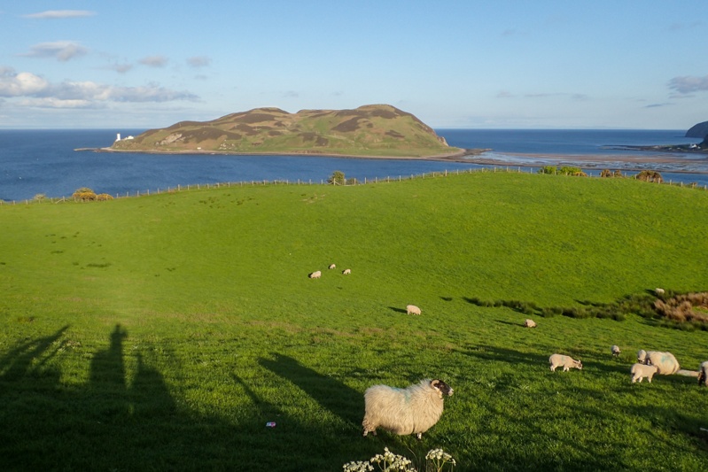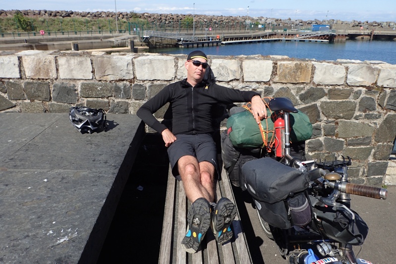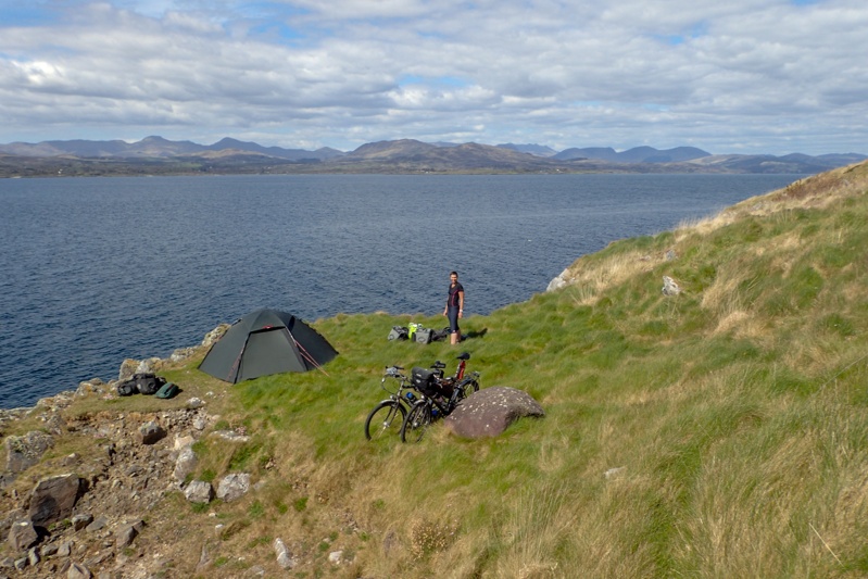Arriving in Campbelltown, we packed our panniers etc. onto our now very wet and salty bicycles (thank goodness for our Rohloffs and Gates drives!) and stopped to buy some supplies for dinner. We had an 11km ride along the very pretty coastline of Kintyre, the coastal landscape is stunning and there are views of the islands all around. We found a camp spot and were then introduced to Scotland's midges that descended in a swarm. We escaped into the tent relatively unscathed.