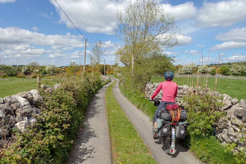 First stop today was at the end of our road where we spoke to two donkeys. They were expecting treats I think and we had none so that was disappointing for them. We had a 25km ride up a slight hill to Strokestown where we would need to do a lot of food shopping as we planned a rest day tomorrow at Lough Arrow. We were pedalling along when an older man came riding his bike towards us, wearing his wellingtons. As he drew near and we were about to greet him, we noticed he had picked a bunch of wildflowers which he made as if to offer to me. I said, "For me?" and we both laughed. "Top of the morning!" he yelled with a smile. The Irish are a treat! The little farm roads were great condition and continued to Strokestown. We stopped to shop and ate brunch while sitting at a table with some stools on the main interesection of the town; it felt very European. I suppose that's because it is European! I love cycle touring on a Sunday, when the roads are quiet and there is no one about. We packed all the food away and headed off.