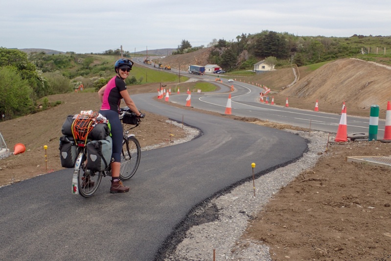 Then something amazing happened, we came across a stretch of main road, also under repair, where a brand new cycle way had been laid alongside the roadway. See pic below. We voiced our appreciation to the roadworkers. We took a beautiful detour around a small peninsula that was very scenic with lovely bays and dunescape and of course sheep and cows scattered about. The views were so beautiful and the weather so good you just drank it all in. The road was dodgy in parts too with rough chip seal recently placed.