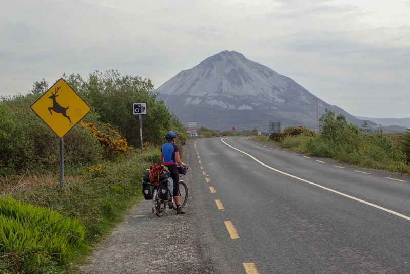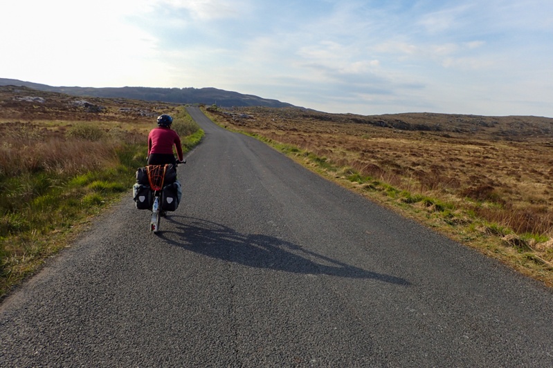 First plan for the day was to try to outsmart the midges, but they woke up when we did and made our lives a little challenging as we made breakfast and ate it and broke camp. A "nice" introduction as they may be present in numbers on the Scottish Islands and of course later on in Scandinavia. First stop was Donegal which we reached on a busier road which had a wide shoulder. We stopped to eat (as usual). Donegal looked a pretty town. We stayed on the same busy road after Donegal, choosing to abandon the cycle route as it did a crazy dance through some hillls. On the main road there was a stop-go for some road improvements and we nearly missed our turn off to Ardara. This was a beautiful stretch of road, gradually uphill though some beautiful country. Next stop was Ardara where we had lunch on the Gaelic Football Club field. The two guys busy attending to the fields were impressed with our progress. Even the smallest of towns and villages have a GAA club with its well advertised lotto draw up for grabs. Some places will say "This week's jackpot EU 24300. Others say "This week's jackpot EU 1200. The fields and clubs are always in tip top shape. After Ardara we headed for the hills through some beautiful bog country with some short sharp hills.