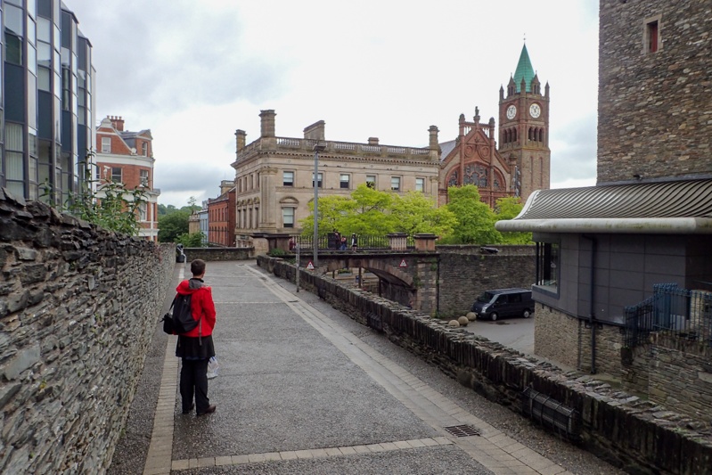 A taxi from here to town only cost GBP6 and it's about 10km away so that was brilliant. We waited about 2 min for the taxi and the driver was very helpful, dropping us off at a good spot to access the City Wall which you walk. He explained about Bogside (the Catholic neighbourhood of murals, riots and Bloody Sunday fame) and the Fountain on the other side of the wall, the Protestant domain. The wall around the old town of Derry is in excellent condition although centuries old and a great asset for the town as it makes the place so easy to navigate. You can just walk the wall and then go down some stairs when you are in the area you want to be. There are information boards along the way with the history of the wall and the town. There are 4 gates in the wall and all were constructed for a certain purpose when it was built. There are also great views of Bogside and its murals as well as Free Derry Corner. It is amazing being up high like this and looking down. Physically this could not have helped the feeling in the place during the Troubles. The whole thing is difficult for us to understand, but we appreciated the way it has all been preserved as a livivng history.