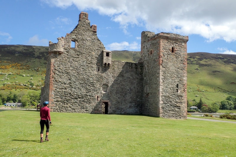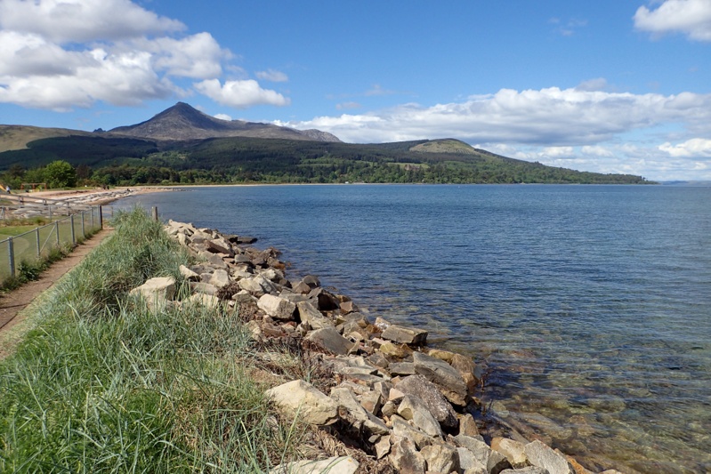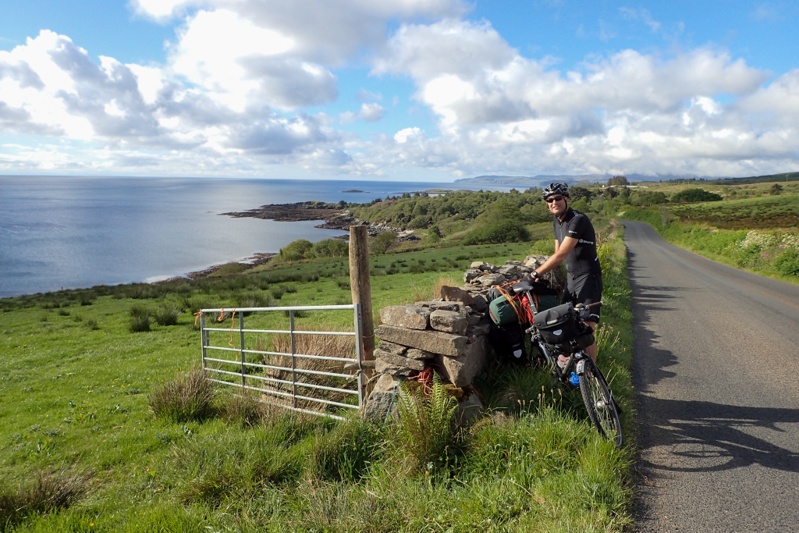 Things were not ideal last night as it was a late night, only pitching the tent after 20:00, the MIDGE SWARM and not having a shower/swim. Anyhow, we slept like logs and then woke to negotiate the bugs this morning. We did not get bitten due to experience and luck but they were quite off-putting. The good news is that the repellant cream (from our Canadian trip) we use on hands and faces (eveything else is covered) works like a charm. At least one positive aspect of midges is that being on the bike is far more appealing than hanging around your campsite! We set off at 08:30 for the ferry from Claonaig to Lochranza - Isle of Arran. Wow, the little coastal road up from Campbelltown had one brutal climb after another. In between there was a nice interlude with a single lane road that mozeyed on up a river valley (still uphill) but afterwards we were back on crazy road. Warning signs grew progressivley worse - 12% incline, 14%, 16%. The weather was great and the views beautiful. We reached Claonaig in time for the 11:20 crossing and got off at Lochranza. What a gorgeous place with it's lovely castle ruin. There was a long climb and then a descent into a lovely Scottish river valley and we stopped to refill all our bottles with ice cold water from the clear stream. After this it was flat riding around to Corrie and then Brodick, the main settlement. Arran is really worth a visit. Everything is quaint and pretty and there are benches overlooking the coast everywhere. It's a lovely place.