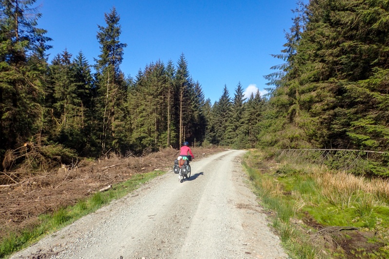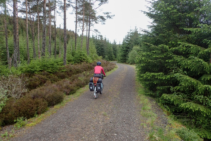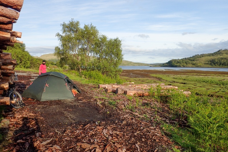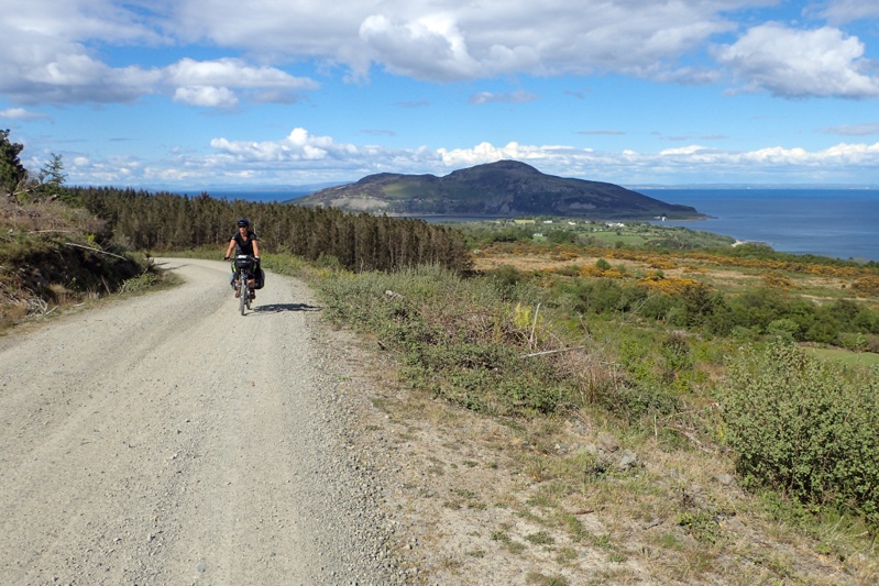 We stopped in Brodick for a delicious pizza lunch and then did some food shopping for later. We also went to the outdoor store and got more bug repellent (Smidge is the local brand, we''ll let you know how it goes), some new gloves for me (all my wool ones have holes in the fingers) and some Kendal Mint Cake (yum). We relaxed in the sun a bit and then back on the bikes for the last climb of the day, first out of Brodick to Lamlash and then the major climb which was an unsealed forestry road that would see us climb over 250m over it's length. It was a solid climb and the surface was reasonable but after the climbing we had done today already I found it difficult in parts. We thought we would camp at a river overlooking the falls but forestry activity there prevented it. A large tract of forest had been harvested and they were relocating the logs. We had a swim in the river anyway and then climbed another 2 or 3 km until we found a suitable bushcamp. We like it as it is in the open and does not seem to have any bugs. All in all we climbed over 1400m over the day many of which were at grades greater than 10%, which is a difficult day. It was after 18:00 when we pitched the tent, so that was a long day. We love Arran though, but will only spend one night here.