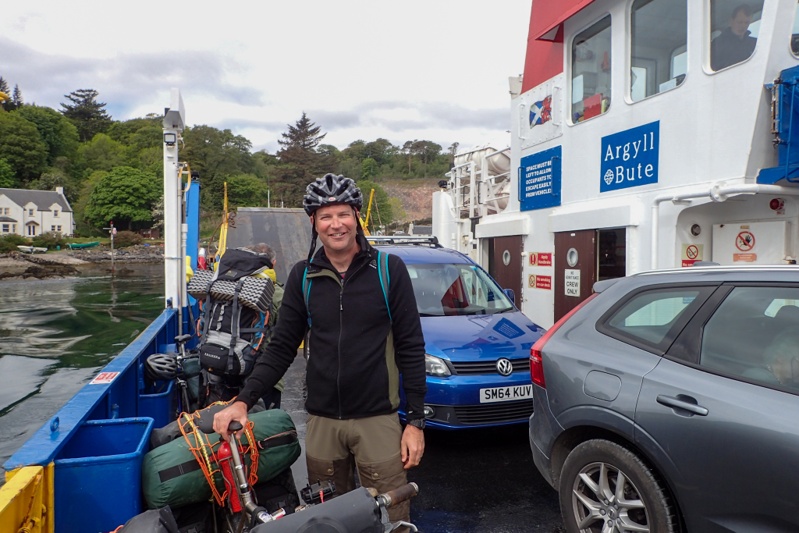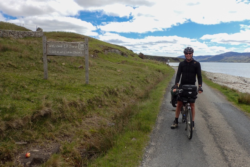 We decided to wake up super early in order to cycle over the hill and get ourselves organized for the ferry, so we were up at 05:00 to find our campsite under a midge seige. We modified or plans and decided to get completely packed up in the tent and then get the stove out to boil water for breakfast and tea, etc. at the ferry terminal. The midges were an absolute plague, so strange as there had been none last night. We've tweeked our defences further in that I put on liner gloves before leaving the tent and wear my balaclava. Mike wears a neck warmer that comes up to join his beanie at his ears. This is in addition to repellant on any exposed skin. They still go bananas. We packed the bikes by the roadside and dashed off at 05:45. As I said, nothing inspires a quick get away like these horrible things. It was a climb for a few kms and then downhill to the terminal where we bought tickets. Calmac Ferries is a huge company and covers all the ferry travel throughout the islands we are visiting. Their rates are very cheap - this 2 hour crossing from Kennycraig to Islay costing under GPB 7 each. We got changed at the terminal and had breakfast and tea, also making flasks for a coffee break later. The ferry trip was comfortable in the lounge we sat in. There was a another cycle tourist from Bath. He was coming across to do the Fell Run on Jura on Saturday. This is a gruelling cross country run across three of the Paps of Jura (mountain peaks). Turns out he had decided to come by bike and not having a bike had purchased one second hand and brought a light weight tent and clothing etc. with him. He was enjoying the freedom of two wheels! We disembarked at 10:00 at Port Askaig and immediately caught the small ferry across a tiny distance to Jura.