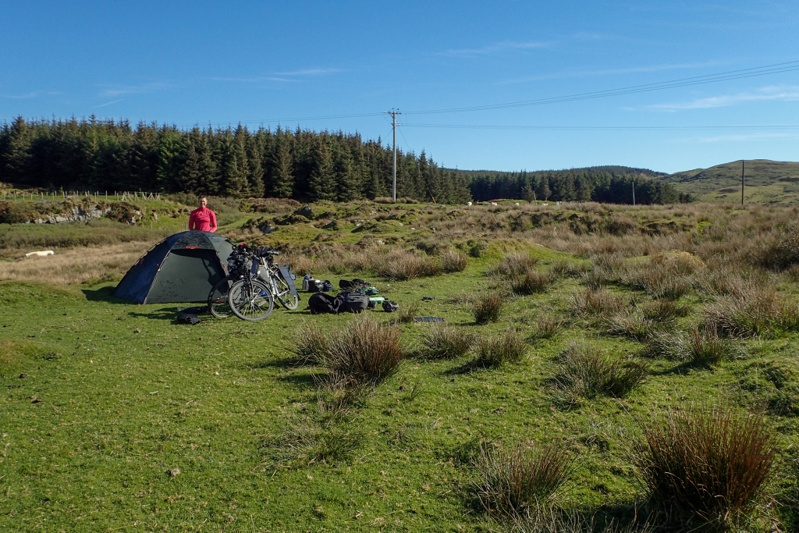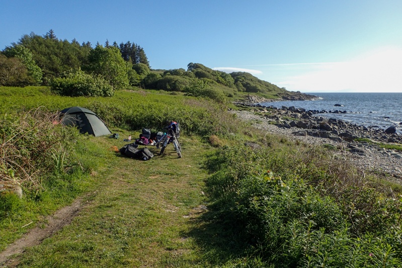 We had a 7km rough descent back to the island ring road and then some ups and downs. We were now on the west coast of the island, which seems much less touristy and more rural; cow and sheep farming. We stopped at an amazing bakery at Blackwaterfoot where we bought a baguette which we ate on a bench outside with cream cheese. It was so good that we went back and bought two more. The baker told us that they allow the dough to ferment for 24 hours before baking. Slow food! After this the riding got flatter as we followed the coast back to Lochranza. The views were beautiful across the sea towards Kintyre. The sun was out with a gentle head-on breeze. Quite a few people out on their bikes; Arran seems popular with cyclists. We caught the 13:15 ferry back to Claonaig and then cycled a few km's up the hill to a good camp spot we found above a river. Just some thorny bramble shoots needed trimming back to clear around the tent. We aim to be asleep early to catch the 07:45 ferry from Kennycraig to Port Askaig (Islay). We were not able to catch it this afternoon as there is no service to Port Askaig on a Wednesday afternoon, hence the sorter day.