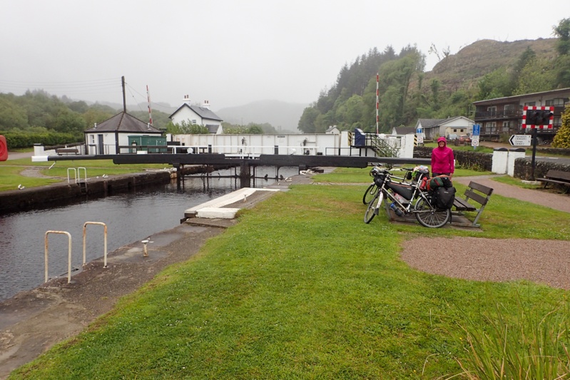 It was a good decision to have a rest day as it rained heavily for much of the day. We were a little disappointed to wake up to find the dreaded midges had moved into our tent (well, under the tent outer) but once the rain came they shuffled off. Otherwise a relaxing day. The rain lifted a bit for us to have breakfast and then returned, mainly squally showers and then drizzle. It was interesting that the dry stream bed that ran alongside our camp was running this morning. As we were getting ready we heard a greeting from the road and there was a man walking with a big pack on. Turns out he is from Bristol and is walking around the coast of UK. Not all at once, in sections. At the moment he is walking from Tarbert to Oban and will then take the ferry to Mull, same as us. We waved him on his way with a promise to see him on the way. It was actually a bit of a novelty, riding in the rain. We have not had proper rain in about three weeks! The scenery is very different with cloud and drizzle. We had a very reasonable and enjoyable climb along single track road and then a descent into Lochgilpean. Just before we reached the village, we hit the Tow Path which is a Canal Path running to Crinan, with 17 locks to pass. We love a good canal path, so thank you Scottish Canals! At the start of the path I posed for a picture with the actual scultpures maquettes (1:10) of the Kelpies which we will see in Falkirk (near Stirling) way in the future. It was pretty cool, see pic. We shopped in Lochgilpean and then continued on the tow path for about 10km. We could sit and eat at a bench in the fine drizzle.