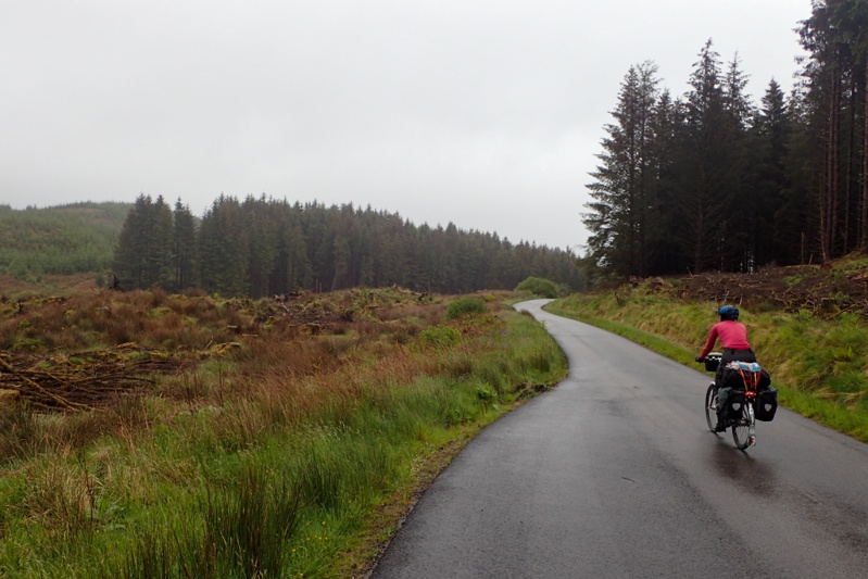The next interesting thing about the route today were the number of ancient burial cairns around the place. We stopped at three and could have stopped at more. They are all sort of 5000 years old and right on the road so you can just have a look as you ride past, or get off your bike and go in to have a look. After these points of interest came the big climb of the day which was more difficult than the first. The road was very quiet and very narrow single track but very good condition, and passed though so amazing old forest scenery. Ancient trees covered in lichen and moss. Mist rising up ahead and rivers in full torrent. All in the driving drizzle and rain. We felt this was a true Scottish experience! The climb continued longer than we would have liked and at the top we put our rain jackets back on. We don't wear them for long climbs as the amount of sweating you do in a waterproof jacket as you climb off-sets the rain being kept off. As we did so we were surprised to see a family come by on bikes. We had seen them earlier at the stone cairns. Dad had two kiddies in a cart behind and Mum had a couple of panniers and a tent. It just shows you that people who want to cycle tour will find a way. They looked as wet as we were. Just as the descent to Loch Awe ended we spotted a path off towards the Loch which provided good access for our bikes and the pick of camp spots. The rain had just stopped by then for our first loch swim of the tour! Wow, it was cold! The afternoon was pleasantly dry (sort of).