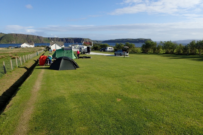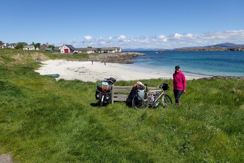 The road became hillier as we continued and there were some very steep climbs around bends in the roads, two in particular. One of these I could not negotiate sticking to the lefthand side and ended up getting off as there was oncoming traffic and the road was of course single track. Mike just managed to hang on to the top, the gradient was 16%, so well done Mike! We spotted a tap on the outside of a primary school at the ferry corssing point to Ulva and I stopped to ask if we could fill up up water bottles. The lady was so friendly and said she'd be out in a minute. She brought us a 1.5L bottle of Highland Spring water, explaining that their spring was dry so they were on bottled water. She was so happy to help! We carried on some steep climbs before descending into Calgary Bay. We had planned to camp there as there is an approved wild camp area with toilets and benches, etc. It was a lovely spot right on the beach, but it was also early; only 12:30. We checked the map annd saw that we had only 18km to ride to Tobermory but there would be another stiff climb, all we could miss out Tobermory and continue to Salen on a road with far gentler hills. We chose the latter option and after Salen camped at Pennygown. This campsite was only 6 weeks old and the man who met us at reception was the owner of Pennygown farm where he had farmed Hebridean Cattle for 60 years. The family had just opened the campsite six weeks ago. It had fabulous brand new facilities, down to a brand new kettle and toaster! Most importantly for us we could do laundry, which we last did 2 weeks ago. 2 weeks being about our stinkiness limit! Camping here also placed us 15km from Craignure and the ferry back to Oban tomorrow. The rain appeared as forecast at about 19:00 and we were relieved with our decision not to stay at Calgary Bay. Mull is a very diverse island. You could not believe that the two days riding we had had were not on different islands altogether and we are happy we went, but the riding itself is not very enjoyable as you have to concentrate so hard on the cars and what they are doing and whether you need to wait or go, or whatever. For that reason we probably would not recommend it for cycle tourists.