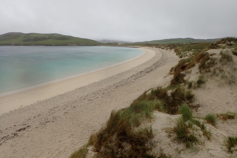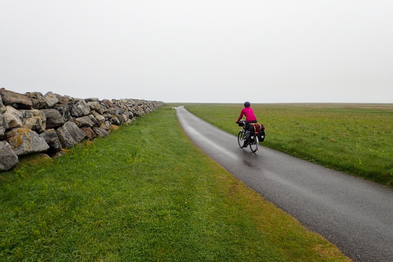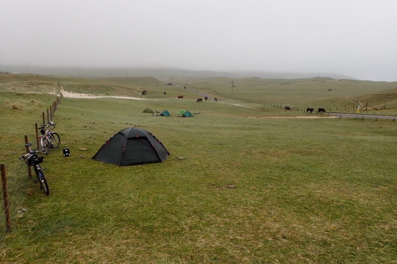 The ferry crossing took 5 hours which seems longer than you would expect! Suprisingly the ferry stopped at Craignure after an hour and passengers disembarked but none could get on which explains why we had to get the ferry to Oban and then come back to Craignure! The rest of the journey passed pleasantly. It was a big ferry annd most of the passengers seemed to get off at Craignure. We arrived to rain in Barra at 18:45. There were many cycle tourists getting off the boat - a group of 5 men, a pair of blokes, a father and son, two girls and a guy and also Iris, on her own from Cologne, Germany who we chatted to. We went to the local public toilets to get changed into cycling gear again and then had a 8km ride to our campsite. We took our time and followed the rear lights of the line of cyclists going up the hill. The climb out of Barra is steep but short and the road winds along very prettily after that. We crossed the causeway to Vatersay pretty quickly. The Outer Hebrides have a wild feel which has been matched only by Jura on this trip. Given the right conditions you could see that the coastal scenery would be stunning. We remembered the white sand and turquoise water from our last trip to the Outer Hebrides (Isle of Lewis). We rounded the bend to the community centre and saw that the group of 5 men and the pair of blokes had put up their tents already on the camping field opposite. The two girls and a guy were just in front of us and heading further on across another field. Here the dune grass is called Machair. It lies flat on sand and is quite sensitive. It has been damaged on the islands by vehicles like campervans parking on it. There was a herd of cows also grazing on the camping field, between the tents. The facilities at the hall were fabulous. A very new and clean shower and toilet block and a kitchen sink as well. At first we were a bit concerned that we would have to wait long for a shower (there are two showers and you pay GBP 1 for a shower), but the guys did not seem to be showering. We were in bed by 22:00. We fell asleep to the sound of a cow noisily chomping grass meters away.