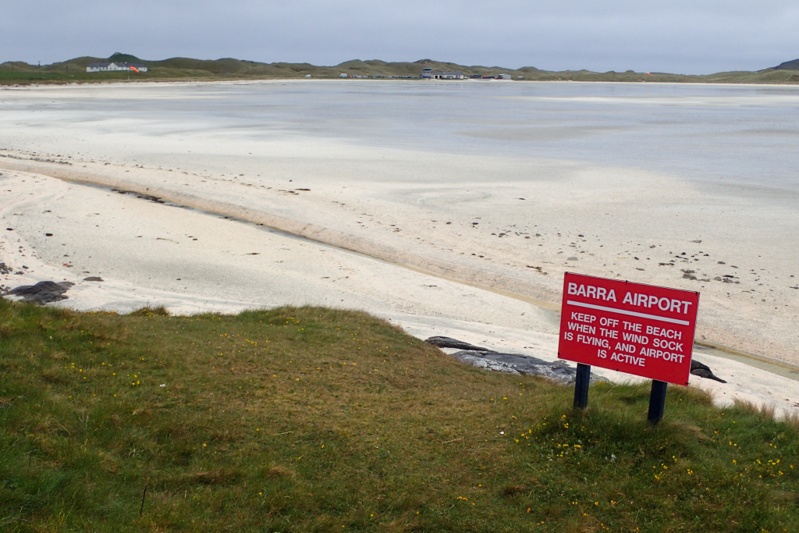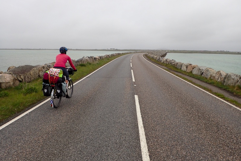 It rained most of the night and the forecast for today was grim. We had a good night's sleep but woke quite tired from the travel yesterday. As always with island hopping, first thought is, "When's the ferry? How much time do we need to get there?". There aren't as many ferry crossings on the Outer Hebrides as there used to be years ago, due to the causeways which link smaller islands, but we did have one to catch to Eriskay today after about 25km. We thought we would get the 09:25 ferry but there was also one at 11:10. We seem to be consistently pulling ahead on this trip and the habit of rushing on is not the best one to develop. So we decided to relax and enjoy the facilties and take our time. We went over to the amenity building where there were benches undercover for breakfast. The 5 men were almost on their weay and we wished them luck. Then the 2 blokes came to pack and we chatted to them. All the people we have met here are doing a week long ride through these islands, it is a very popular trip for cycle tourists. We were on our way by 08:30 is the drizzle and first had to climb back up the steep hill from yesterday back towards Castlebay. From there it was quite an easy ride, just one other short climb. The roads here are also single track but very good roads and also the drivers are mainly locals so there is less stress about. As we were clearly going to be in plenty of time for the ferry, we took a detour to the Barra Airfield which is an official airport that has flights scheduled from Glasgow and other places, the difference being that that planes land on the beach when the tide is right. It was a cute place (see pic). We had hoped to see a plan arrive but none obliged (probably due to it being high tide by the looks of it). The guy we met on the ferry to Oban from Mull said that once when touring Barra they camped on the beach and next morning an official came to ask them to move their tent so an airplane could land! The rain came in heavily while we were at the airport but it was only a few kms ride to the ferry port. There was a great little terminal, heated and with a cafe. We got chatting to a group of about 5 ladies from London who were also here to ride the Outer Hebrides. They had flown in to Barra and hired bikes. There was also an elderley couple who were cycle touring. The 2 blokes were there too and the father and son arrived. It is quite nice not to be the only cycle tourists around! The crossing took under an hour and then another climb uphill took us off Eriskay almost immediately and over the causeway to South Uist.