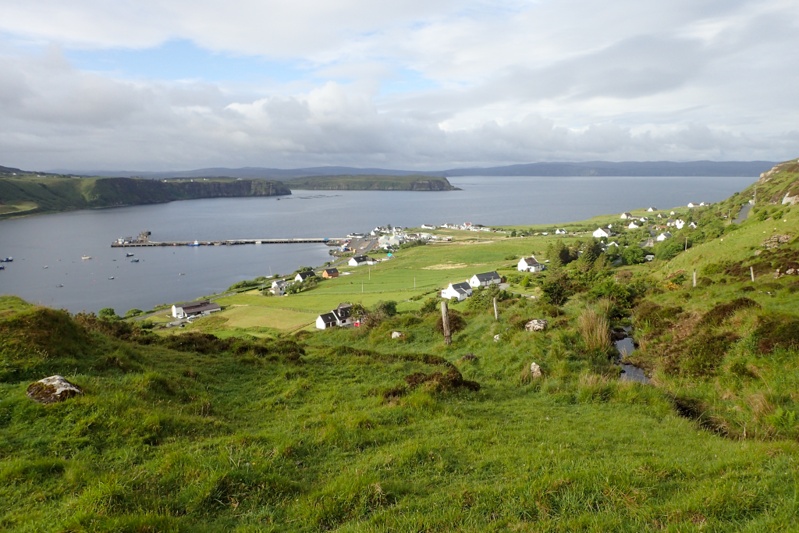 By the time we reached Portree the rain was mostly over. We stopped to buy food for lunch and ate at a bench at the harbour. We left Portree via a minor road east to Bracadale. This ride had some short steepish climbs to start with, but the scenery was superb through bog and hills. As we descended into Bracadale the cliff tops of the peninsula were clearly visible. It turned out to be a beautiful day. As we stopped to rejoin the A road towards Sligachan, off-duty Policeman Dave caught us up on his bike. He was such a great guy to meet! We had a good chat about bikes and touring. He lives locally and the road we took from Portree is his daily commute to and from work! Lucky man (at least when the weather is good)! We had a laugh about a few things, including the people that shuffle out of their cars in Portree to look at the shops and then shuffle back into their cars and move on. Then they go home and say they have seen Skye. He also warned us about people driving on the wrong side of the road (from Europe). As if we did not have enough to worry about! Anyway, it was so nice to meet him and share in his enthusiasm! After this, the road to Sligachan was also easy on the eye, full of massive views of the Cuillin Hills in all their glory. Shortly after Sligachan we found an amazing bush camp high up on the ridge near a little waterfall. We had a great afternoon and evening sitting on warm rock ledges in the sun after our creek swim! The spring high tide that Dave remarked on seems to have caught a bunch of sheep grazing on low lying land in the bay below unawares. The waters rose until tiny islands formed, growing ever smaller. There were Mum and Bub sheep on a few of these. Eventually one Mum and two Bubs made a break for it, swimming/jumping/wading through the water to safety. But as I write there is still a stranded Mom and Bub who look as if their island has all but disappeared, and they're knee deep in water. We checked online and the tide should just have turned so they should be alright. Stay tuned.....