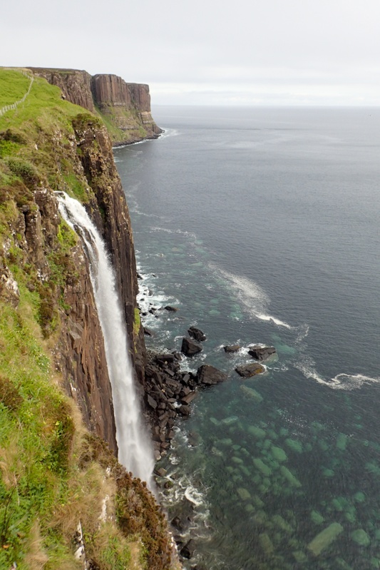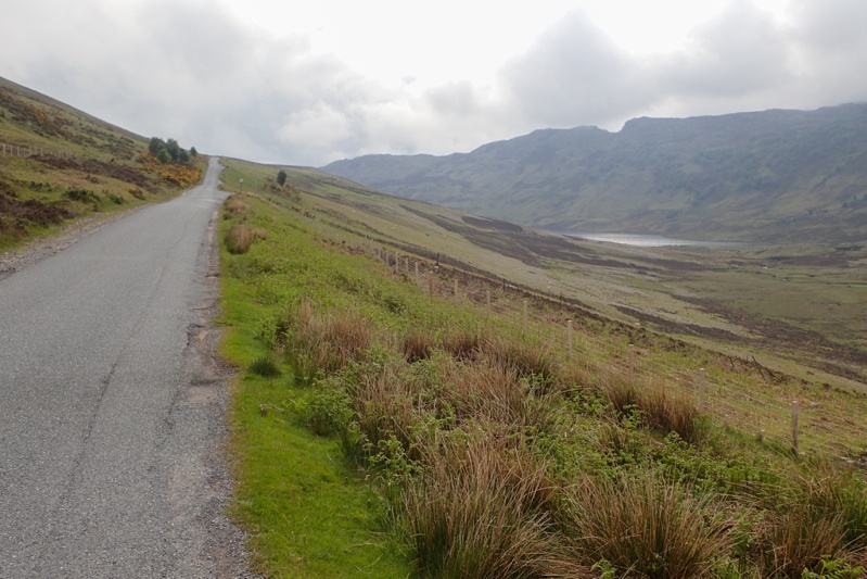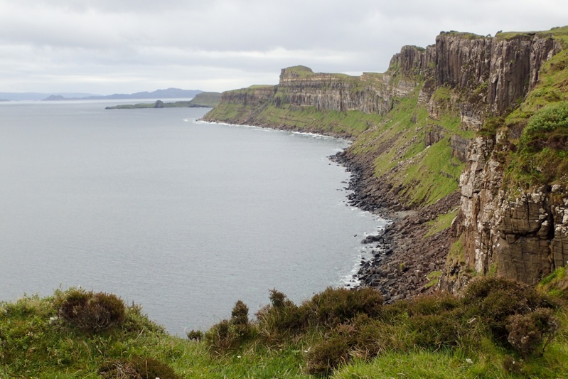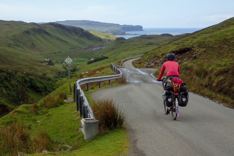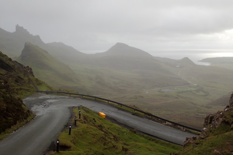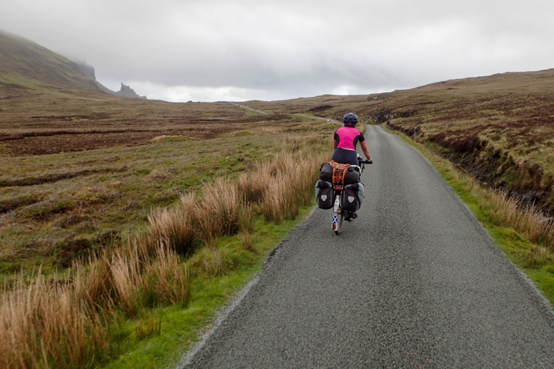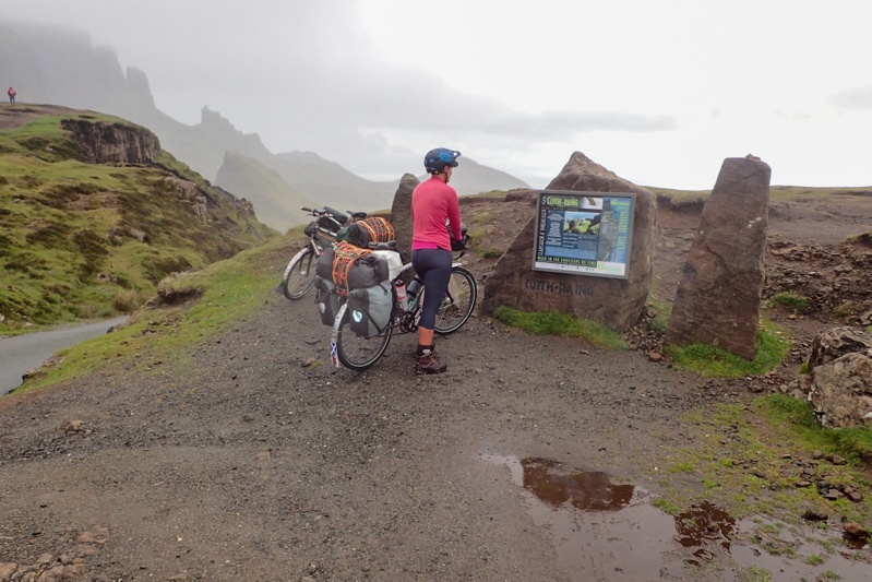 Looked like a good day when we woke up, just overcast mainly. We were pretty excited to be on the road again and left by 07:30. Our route today would take us immediately up a 250m climb across the Trotternish Peninsula through a geographical feature called the Quiraing. This was a spectacular 10km stretch through high bog country and then at the top you descend down through amazing cliff landscape. It was very beautiful, the climb was easily managed and the road was quiet. We would recommend this route for cycling. Over the other side the rain appeared again, but we could see the legendary Skye emerald green slopes through the rainy mist. It has that other worldly quality. We rode the main drag down to Portree passing Kilt Rock (looks exactly like the folds of a kilt) and the Old Man of Storr. As usual these well-known landmarks draw throngs of people, all trying to squeeze into the last parking spot, or at least, the last bit of spare bitumen.