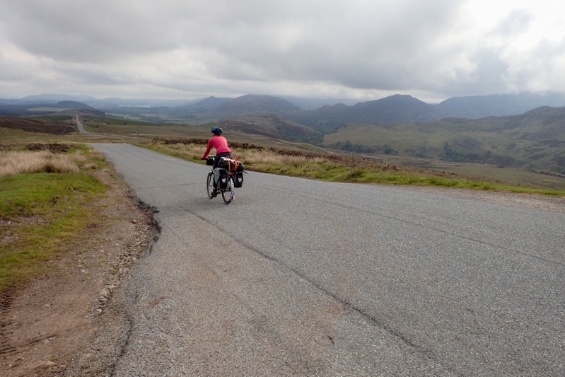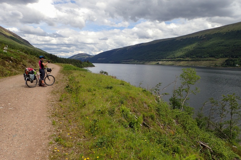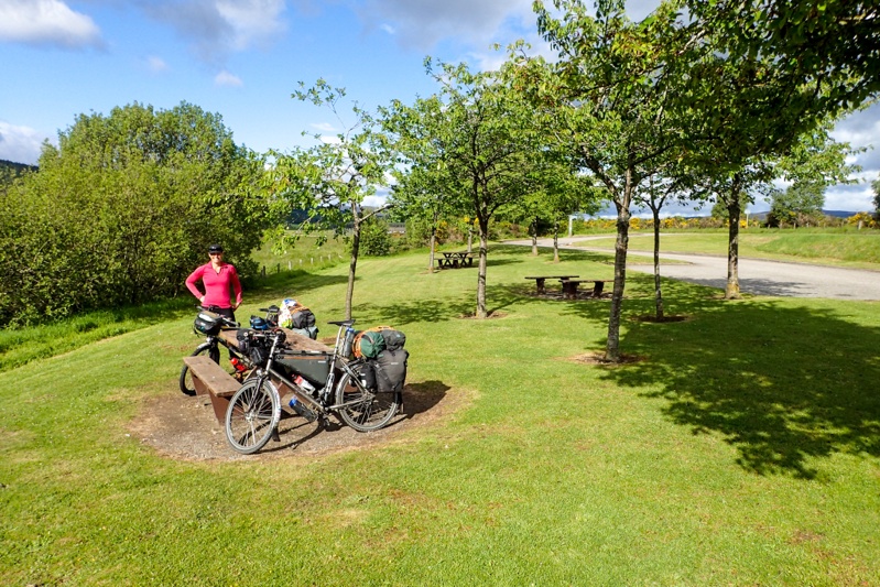 We had an early start before 07:00 partly due to the bugs, and partly due to the day which was to be long and quite challenging. The weather was great. No wind, no rain, just a bit cloudy. We had a quick 15km to Fort Augustus where Loch Ness lies adjacent to the Caledonian Canal. This is a very quaint place right on the water which we would recommend visiting. Almost straight after, our big climb of the day started, a 400m monster which took about 70min to climb. The first 200m are covered in one go, fairly steep climb at 10% gradient over a few km's. The road is well-graded though, so you climb at a constant speed. Thereafter there is further climbing at slightly less steep grades, but very steep to start at 11%. THe climb takes you up into the high country and we saw many deer today. Firstly one or two around the campsite and then two seperate herds up in this high country area. The road is single track mostly but has two full lanes over the climbs. It amazes us to think of the diversity of scenery that the Great Glen Way affords the cyclist (or hiker). We dropped down after reaching the high point and stopped to look at Foyers Falls which was not worth the walk.