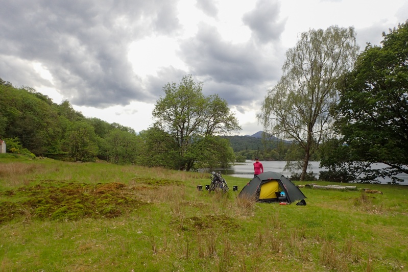 After lunch we set off with about 30km to go. Cycle route hacked us off by going uppy downy and we considered stopping at beautiful Loch Moran after 6km. However the signs at all the little pull off areas advised "No Camping" and more strenously than that, there was also a handmade sign advertising Midge Repellant stronger than DEET. As I said to Mike, instead of these "No camping" signs these communites put up, which are not even legal anyway according to the Scottish Outdoors Access Code, they should just make signs which say "If you camp here you will regret it - Midge Heaven". We decided to go back to our route where lo and behold we discovered that there is a dedicated cycle lane all along the main road to Fort William. This will mean that we can chop off an entire loop on our route that we put in due to concerns about this road. We even came across a bloke who lives in Fort William and works in Mallaig and catches the train one way and cycles the other (he was on his way home). Anyway, it was raining again and we came across a cute bush camp at a river and called it a day. We had a reasonable rinse off in a nearby stream. We got an text from Post Office Lady to say that Royal Mail considered they have met their service committment in delivering our item to the post point in Mallaig and it was not their fault that some idiot received the item and sent it back out. At this point it cannot be held at Fort William for us to pick up and is being sent back to the same idiot at Mallaig who will return it to Amazon (eventually). How useless is that?