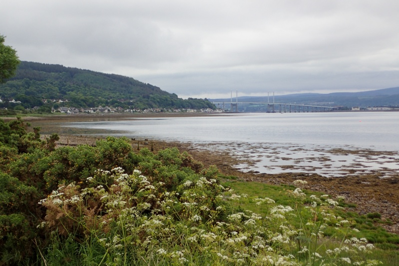 We left wet Dingwall making our way back to Inverness. The cycle route is easily navigable, but as we had ridden the main route already along the A9 during 2015, we took a different route down to the river through North Kessock to climb up and over the Kessock Bridge again. The route was okay, but had some really dodgy tracks in it which made for some bumpy riding. The climb up to the bridge was SHORT but STEEP! We are following National Route 1 which is also the North Sea Route and it took us easily through Inverness. We bought some lunch and snacks at M&S and thought we would sit in the mall and eat our lovely muffins with our flasks of coffee (we had already ridden 30km). Then a seagull came over my left shoulder and took my muffin out of my hand. I was very cross. Inverness just gets worse!