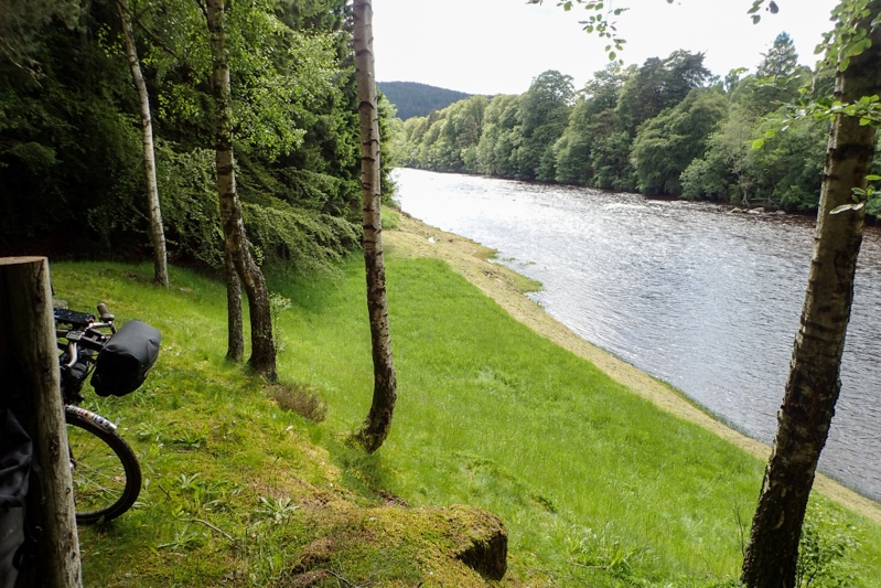 We headed through Aberdeen on the North Sea Cycle Route. Last time we were here we followed it south, this time we turned onto Cycle Route 195 which is the Deeside Way. This is a cycle and walking trail and it is a rail trail! We are happy cycle tourists today. It starts at a park in Aberdeen and is busy for the first 10km as many people from the city use it, so lots of families with little kiddies on bikes, etc. A beautiful bitumen surface. After this is turns to a rough track, sometimes gravel, sometimes rocky. It is not that well sign-posted in parts but we were ok as we had programmed the route as usual on our mapping program/GPS. You pass through a couple of villages with Ballorchy being the largest. It is easy and convenient to shop along the way which we did there. The route is pretty mediocre scenery-wise but a nice recreational option. It took quite a while to actually hit the River Dee which is beautiful and was flowing strongly. The most picturesque part of the cycle route came after Ballorchy when we actually turned off the route and cycled through Blackhall Forest. Lovely forest trails running along the river. We found a good bush camp away from the river and then continued to it to have a swim. The water was not that cold actually! The river is a very popular fishing spot. We did not actually see any fishermen, but there are plenty of bothys and huts, and the grass is kept mowed alongside the river so it all looks very neat. On the other side where there is access from a main vehicle route there are quite a few fancy properties or estates which are landscaped down to the river. We had another rain shower just after we pitched the tent, but as I write now the sun is baking and the sky is blue. Hope it lasts!