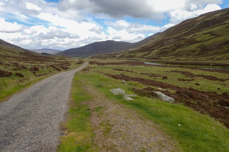 The bush camp was dead quiet last night, except for several loud barks or squawks as it got dark. Not sure what made them, but luckily we ain't in bear country on this trip! We were up early to a reasonably sunny day and made short work of the little climb out of the forest to the Old Military Road. We passed through Slewdrum Forest just as we got back on the road. We followed this road until the first little settlement where we tried to go back on the Deeside Way, but abandoned it when we encountered a incline of about 20% over rocky terrain. What were the designers thinking? Anyway, the road was busy with morning traffic but the motorists were patient and it soon quietened down. We stopped at a picnic site just after Aboyne for a coffee break and then crossed into the Cairngorms National Park where we were informed by an engraving on a rock "You are now in the highlands". The road through the Cairngorms was very beautiful, taking in wide views of the spectacular River Dee, old woodland forest with thick mossy carpets and old stone walls. It was a beautiful route all day.