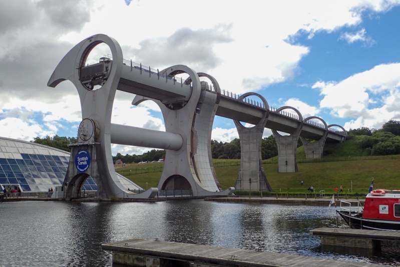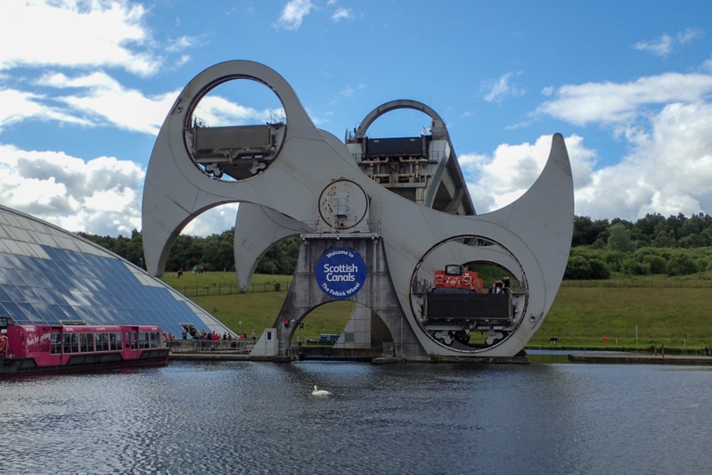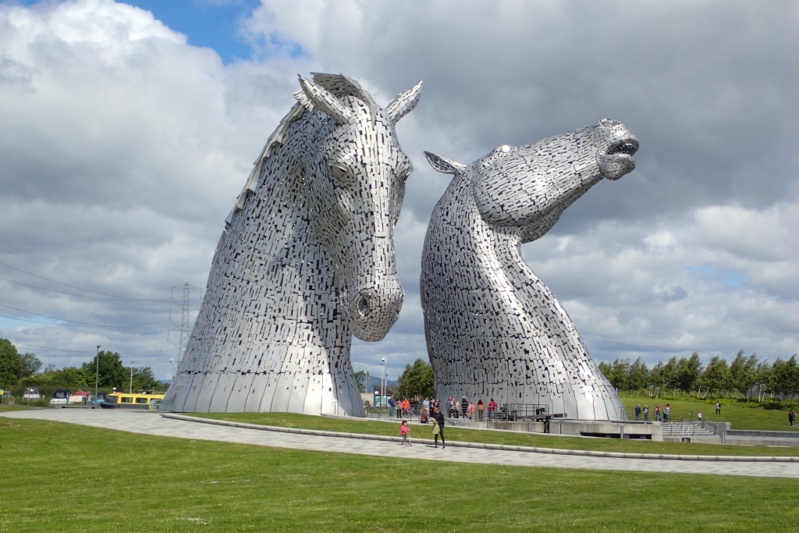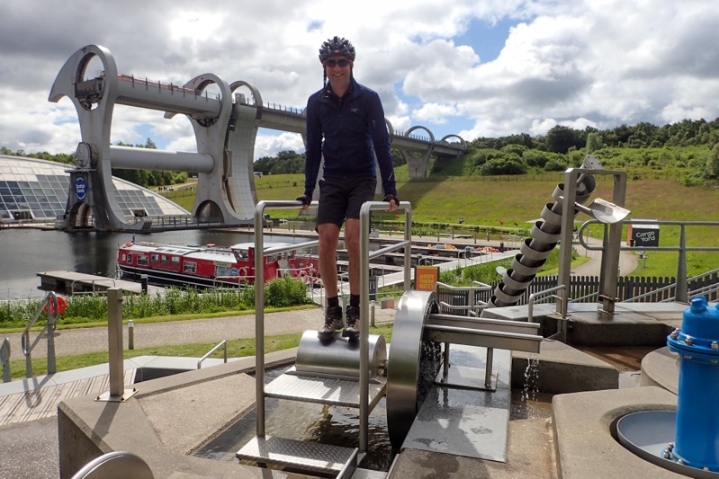 It was a fabulous sunny day today almost all day (we had a few light showers). We had such a fun day! we left the hotel at about 09:00 and then left Stirling on a great cycle route, national route 76 which was as good as the route into the town. We left the route to join the Clyde and Forth Canal at the famous Falkirk Wheel. This piece of enginerring has to be seen to be believed. It is a boat lift that picks vessels up from the Clyde and Forth Canal and lifts them 35m to the Union Canal. It is ingenius. Having the Wheel replaces 11 locks. We were lucky to see two boats being lifted a few minutes after we arrived. The whole area that the wheel is situated in is interesting, there is even a children's (and adults?) playpark which allows you to demonstrate how things like the Archimedes Screw and various water wheels can move/lift water. We had a bit of a play there. The Wheel is quite popular and there were quite a lot of people there to have a look (but not as many as we thought i.e. no bus loads). There is a good vistor's centre too. After this we rode a few kilometers along the canal to the Helix Park to see the giant equine head statues, "The Kelpies". A long time ago on the Crinan Canal in Kintyre we saw the maquettes and now we could see the real thing. They are huge! They are a memorial to the work horses that pullled the barges along the canals traditionally.