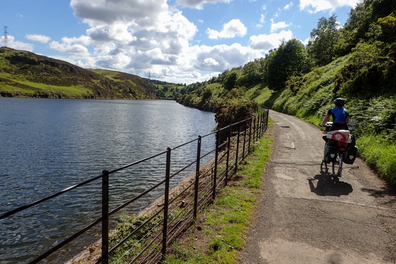 We were only a few kilometers from Edinburgh city centre when we started a climb up to Pentland Park. We had orginally planned to go to a campsite tonight but looked into options for wild camping near Edinburgh and found this. It is a huge area of wilderness that overlooks the massive city. There are a couple of reservoirs and we picked one just inside the park (Torduff). We climbed up a sealed path and then walked our bikes up a rough track to a wonderful campspot with views of the city, castle and all. It was quite busy up there with hikers, mountain bikers and even a scout group that hiked by on their way to camp at Bonaly Reservoir. The weather was absolutely perfect. This is the first evening we have had at a bush camp (or probably any camp spot) when we did not have to put the tent up immediately. The views are dramatic; the city and Forth one way and highland hills the other. Sheep and lambs are grazing around in the heather. What a way to spend a perfect evening? The sun was out 'til late (Midsummer). It could be the best evening Edinburgh will have all summer.