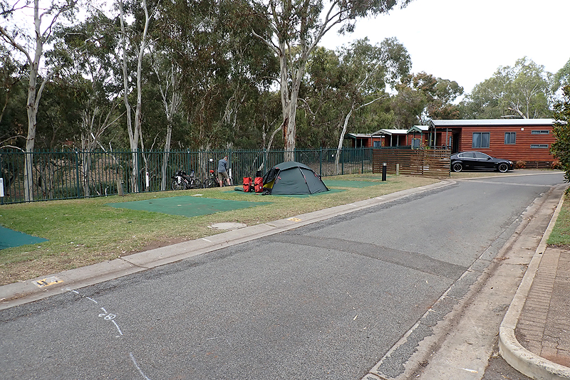 We arrived at Adelaide airport and found our usual out of the way spot by the smokers corner to put the bikes together by 15:20. This went well, until Mike got to pumping up the tyres with our trusty Lezyne mini-pump and found that the air was escaping somewhere. Adelaide airport has bike facilities with storage and a bike station, complete with rusty tools and a dodgy-foot pump, but we decided that obviously we needed a workable pump to take with us. It was 16:40 so there was a bit of urgency as shops tend to close at 5 pm. Mike took a cab to a bike store 7km away, bought one and was back in half-an-hour. while I sorted out our gear. We ended up getting on the bikes around 17:45 and left the airport with only one or two wobbles! At the start of a tour the weight on the bike always makes us wobble a bit. The roads were quiet and we soon hit the Torrens River cycle path which is excellent and we are sure also pretty, but it was dark and our bike lights were firmly fixed on the path ahead. We got to our campsite after 19:00 and enjoyed slightly soggy Subways purchased about 2 hours earlier at the airport. Our new sleeping bags were good!