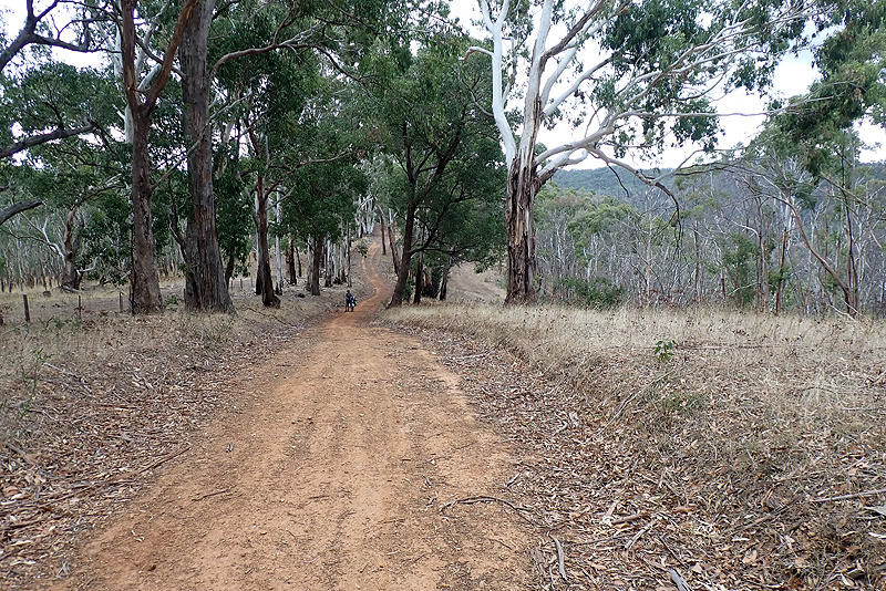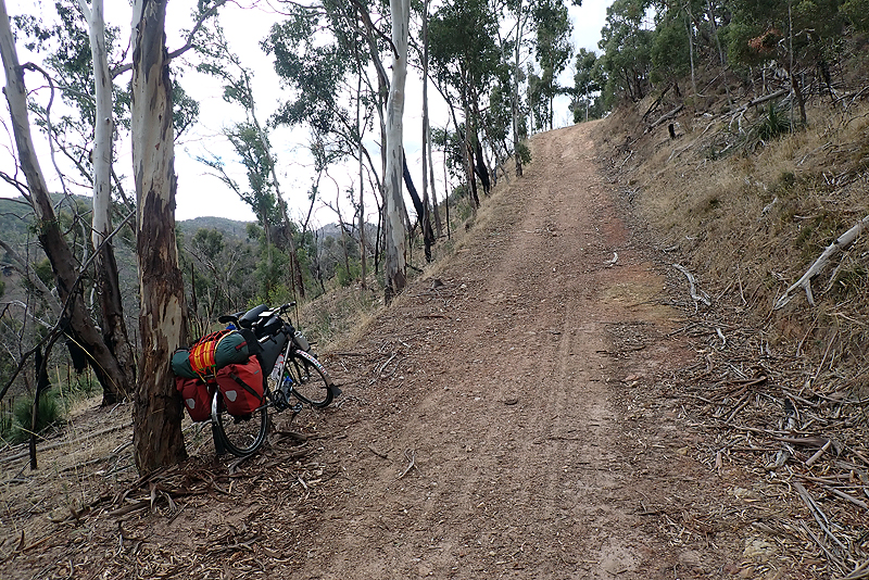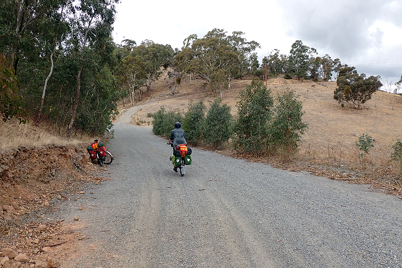 After breakfast consisting of oats and hot water in the campers kitchen, we organised our packing a bit better and so we only left after 09:00. The weather was really good, very calm and cool, and a bit overcast. We are on the river path again, can confirm it is very pretty in daylight. We turned off it after about 12km onto Gorge Rd which meanders uphill along the river. This is a great road to ride and we recommend it, however we turned off after a few kilometers onto the Mawson Trail. This was a decision we would regret. The trail is 900km long and promises a variety of farm roads, forestry trails and GOAT TRACKS (not really goat tracks). But a goat track was what we got today. In the end it took about 4.5 hours to "ride" 10km. Obviously not a track for cycle tourists. We spent most of the time walking, but by walking I mean me pushing the bike uphill by it's handlebars with Mike pushing from behind, with all our might! The inclines got to way in excess of 20%, and we can't even push a laden bike up that on a slippery surface on our own. Only thing to do was for us to get one bike to the top between us and then walk back down and get the other bike. So each time we walked 3 times the distance we would have had to ride. If only riding had been possible. Then once at the top on the hill you could ride for a few hundred metres before you got to the next crazy hill and had to do it all over again.