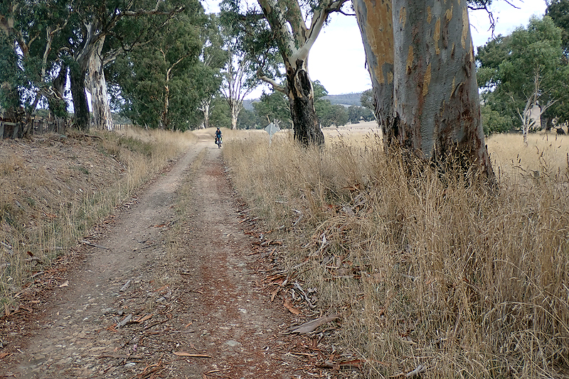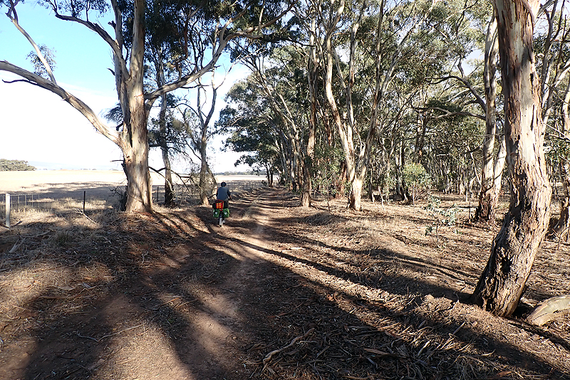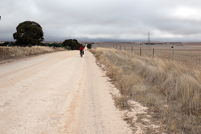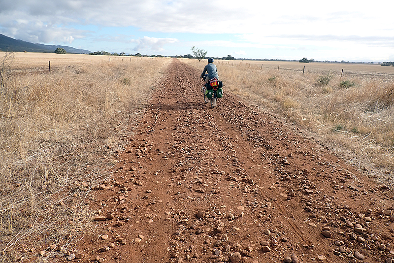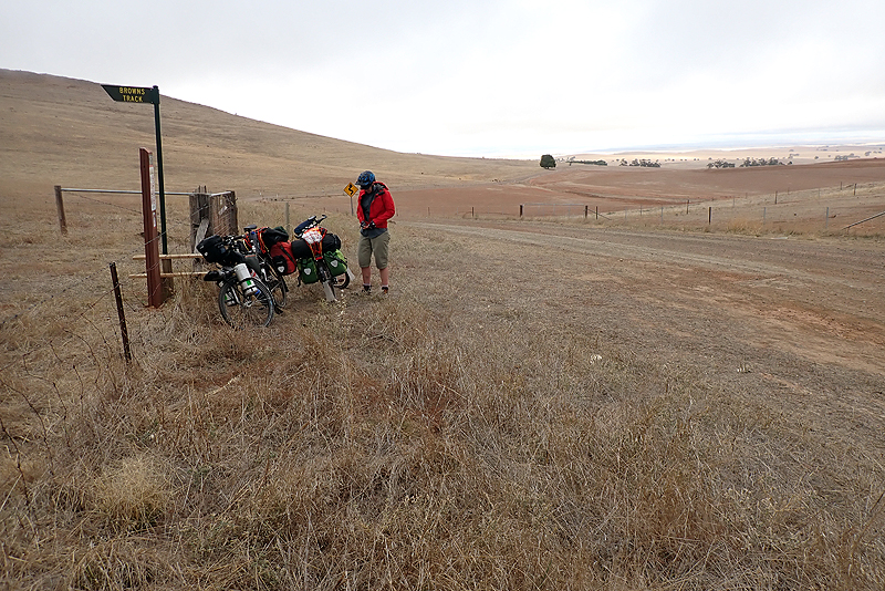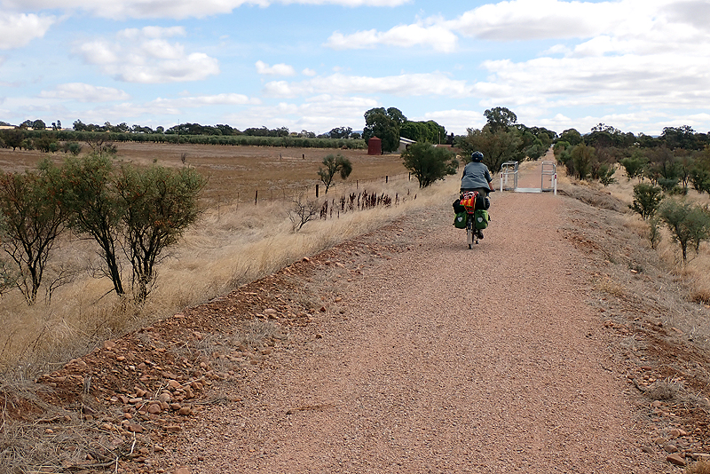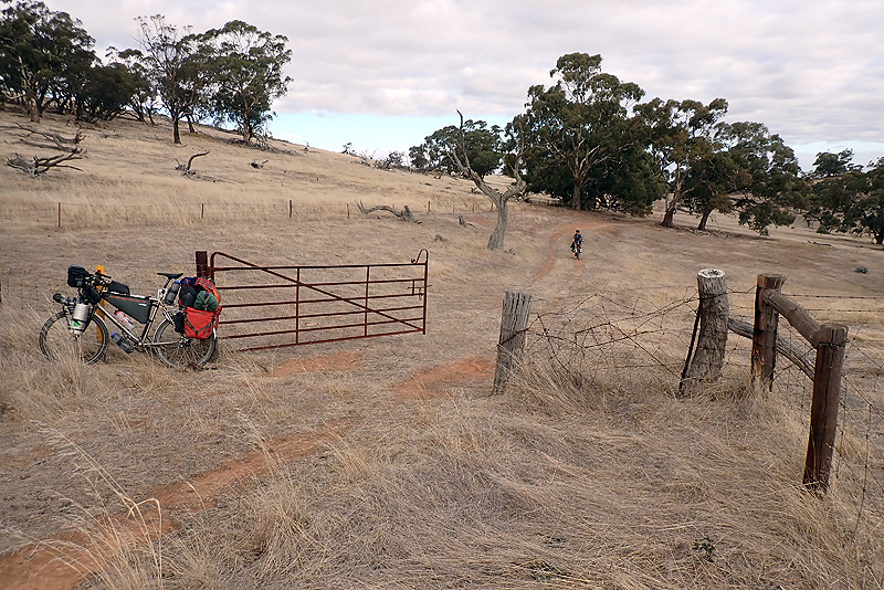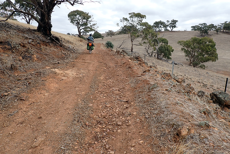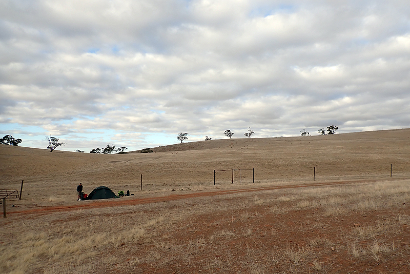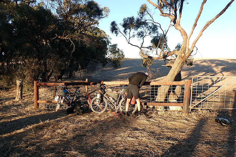 The roads have dedicated cycleways and it was good to see some civilisation. After Nurioopta we are back on all sorts of farm tracks, gravel, sandy, heavily rutted from water, and my special favourite which was rocks just strewn everywhere. But it was ALL rideable at least. Sometimes quite slow. Had a fall on a sandy patch, hopefully that is my fall for the trip over with. We reached Kapunda and headed out again for about 8km to reach a campsite on the Heysen Trail (walking trail) but about 1km from it there was a locked gate and the sign said it opens 30 April. We decided to camp right at the gate as the place was farmland and quiet. We had picked up some water at Kapunda but as there was a water tank at the campspot we had not factored in extra water for showering. Amazing what you can do with a couple of litres though! Good training for later on in the trip. As always when we camp in this sort of place we say "What are the chances someone will come though the gate?". Lucky for us about 30 min after we had both showered along came Farmer Joe in his rattling farm vehicle. He was so friendly and obliging and even offered to let us through the gate to the water tank. As he was going into town he offered to get us something and also was happy to help with firewood. People surprise you how obliging they are. We didn't need anything, other than our bed. We arrived before sunset so that was a win!