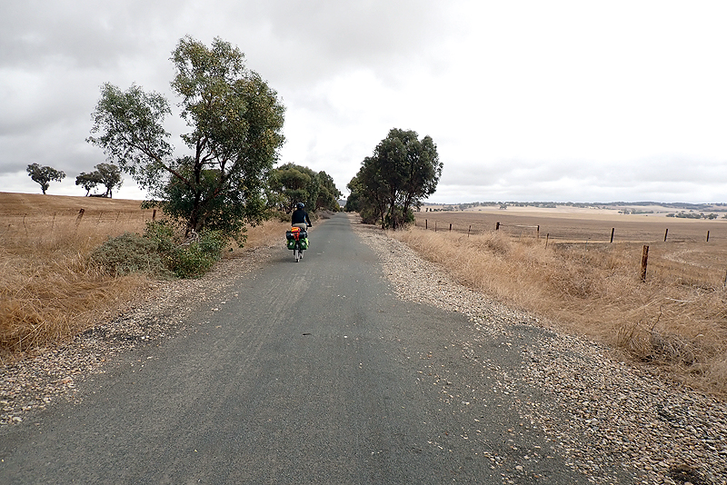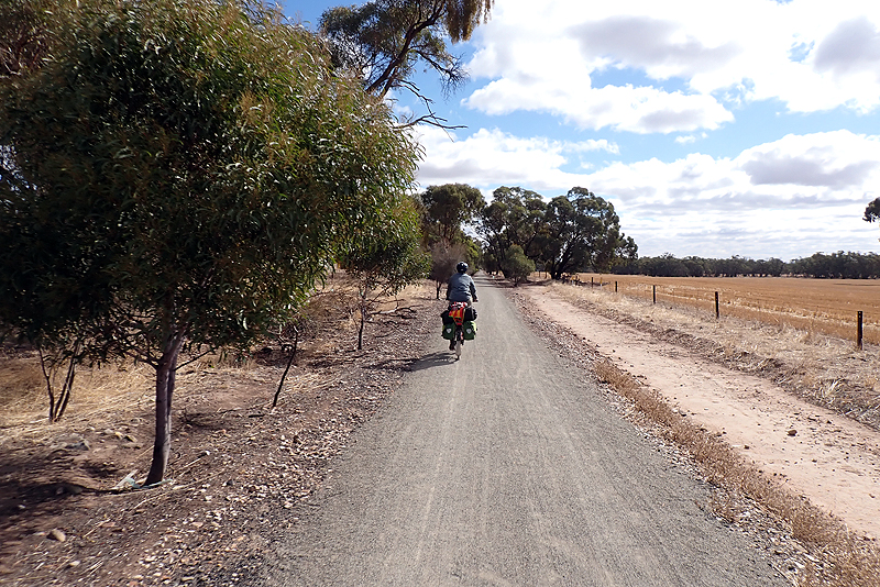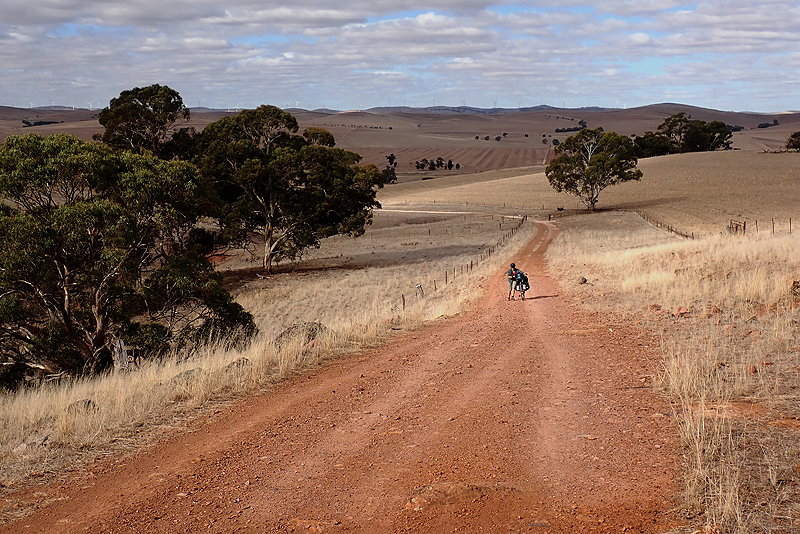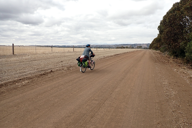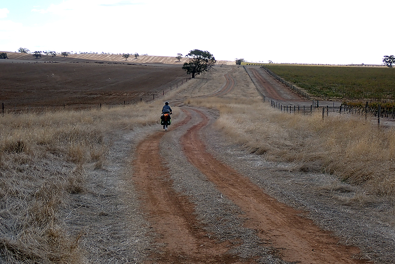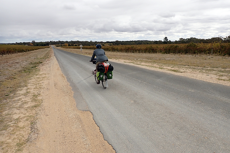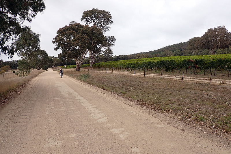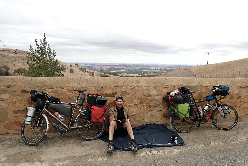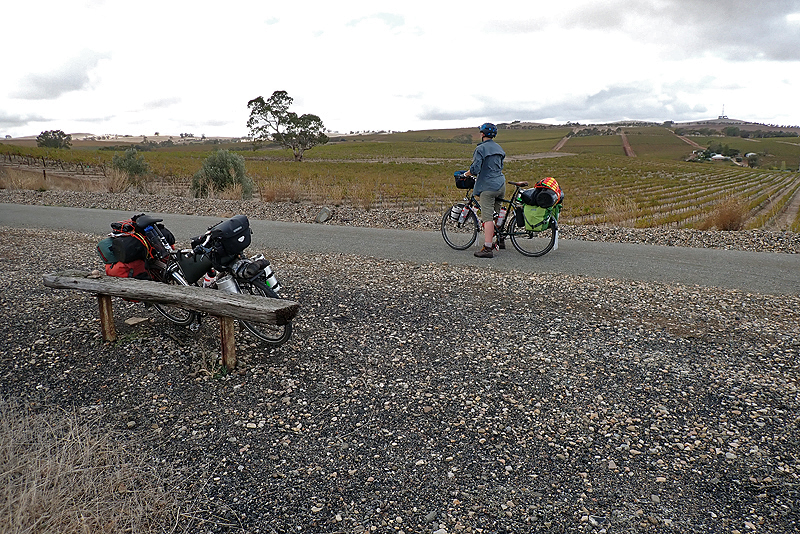 The night was dead quiet until the logging trucks started up at 04:30. We had some bike maintenance in the morning, sorting out a dynamo that we thought was not charging a phone gps correctly, tightening bolts, etc. We ended up leaving around 09:30 again which is really late for us on tour. The first 12km were on good surfaces with short steep climbs. This took us to Trail Hill where the Barossa Valley suddenly appeared far below us in a patchwork of farms. We had our morning coffee break up there before dropping down very quickly to the valley floor. So this is the famous Barossa Valley. You can actually smell the wine around the vineyards. Looks like the harvest is over for the year. Nurioopta is a lovely village/town and we stopped for lunch.