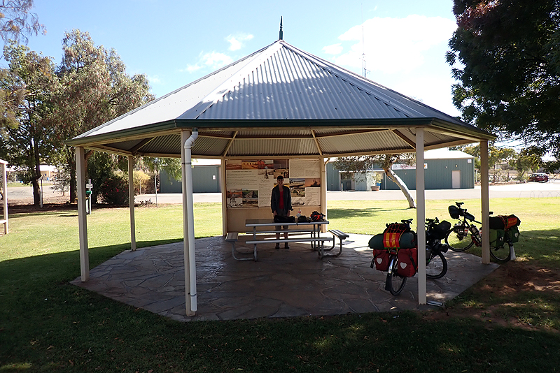 We stopped in Riverton for lunch and the heavens opened. We found a spot undercover behind the public toilets with a wall plug and sat and ate our lunch and charged our phones. The rain stopped after about an hour and we got onto the Rattler Rail Trail which took us to Auburn and the Reisling Rail Trail, and then on to out campsite just before Clare. Got to love a good rail trail and 42 km of good rail trail is a great thing for a cycle tourist. There were many "Cellar Door Open" signs where you could purchase wine if so inclined. The rail trails had great picnic spots and were impressive. We arrived at our campsite at 15:30, just goes to show what you can do when you get up earlier! We wanted to do laundry as our cycle clothes took a turn for the worst on day one on the crazy hills and the only answer to that problem is a washing machine. The campsite is busy and the laundry super busy. The amount of loads of washing people (women) do in these places is astounding. Only one drier was operational. Anyway, we now have clean clothes.
