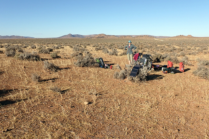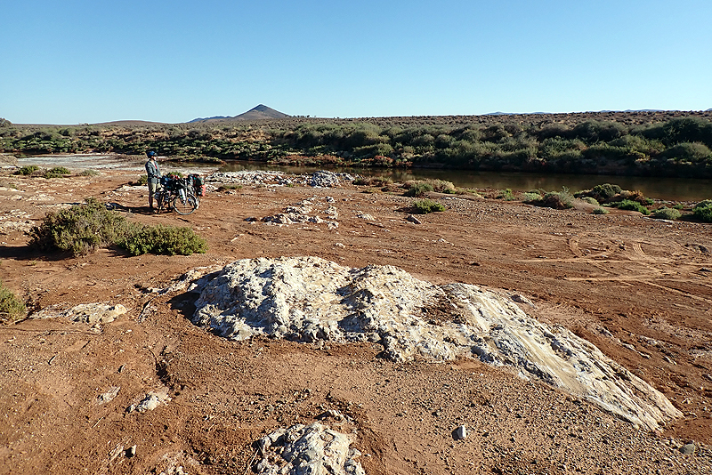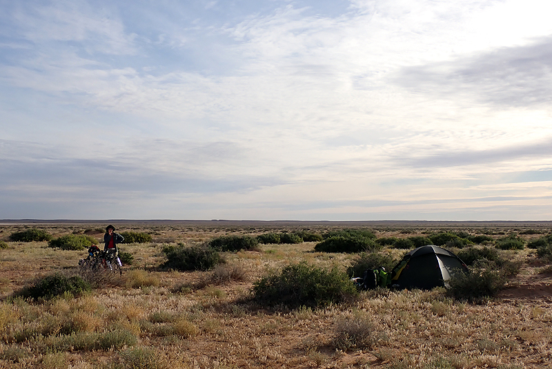We found a good bushcamp at the 80 km mark. Overall today was much cooler and this looks set to continue. It makes a big difference feeling comfortable riding until 15:00. Our camp spot is 13 m below sea level which is a little strange, but dry.