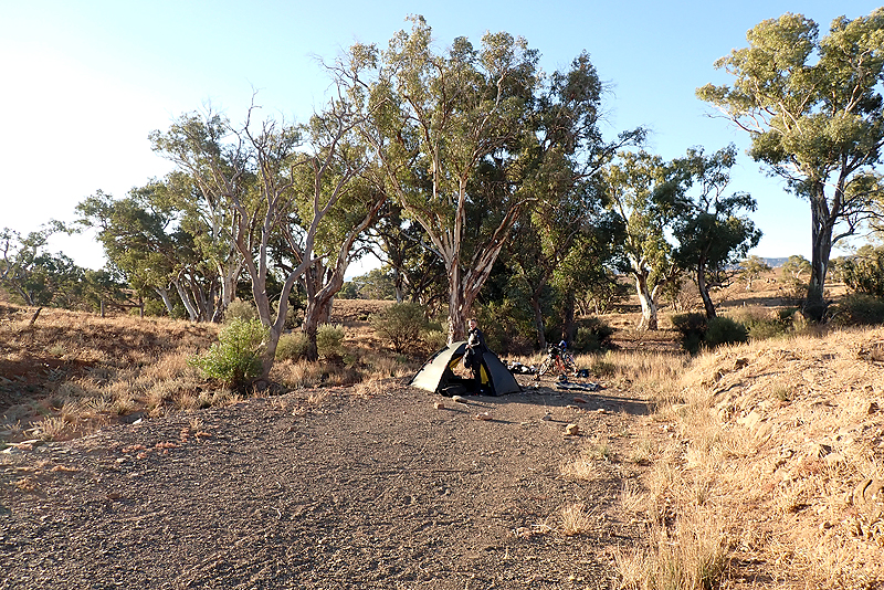 We had a slight tailwind today and it is just amazing what some good bitumen combined with the wind can help you achieve. We only had morning tea after 54 km and the butter and jam sandwiches kept us fueled for the rest of the day. It was a great ride. The road has a shoulder, very narrow for the most part and rumble strips separate it from the road, but they are not difficult to ride if you end up on them. The traffic was mainly quite quiet and mostly caravanners and the odd road train. We stopped a couple of times after morning tea at designated picnic areas. We were able to get more water at a tank at Marryat Creek Picnic Area and camped a couple of kilometres after this.