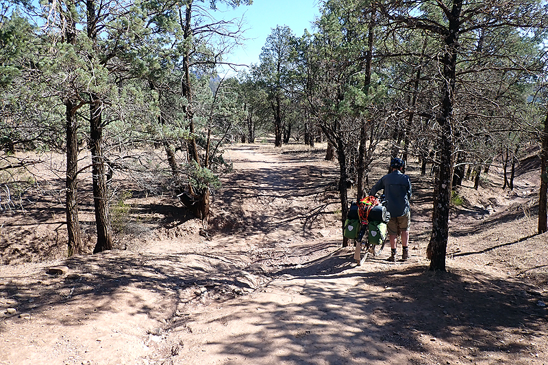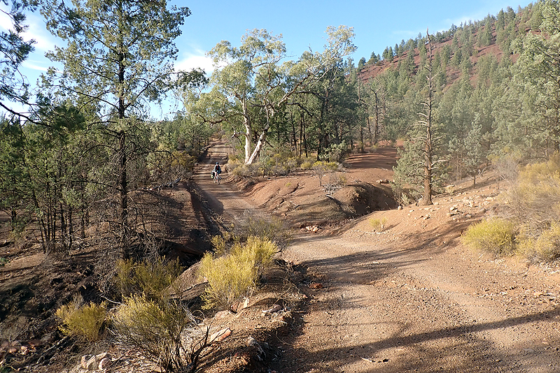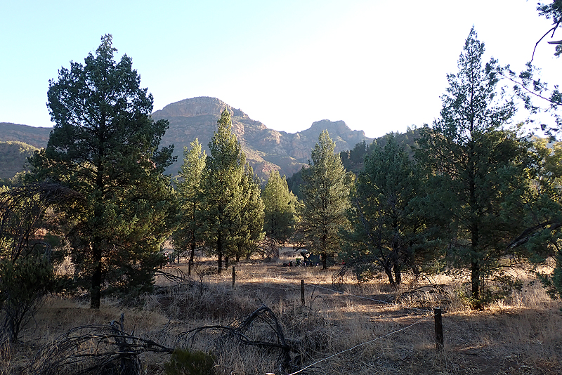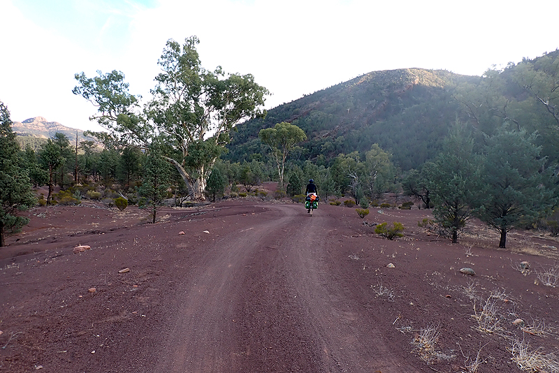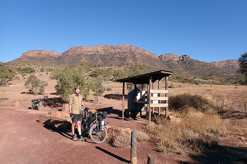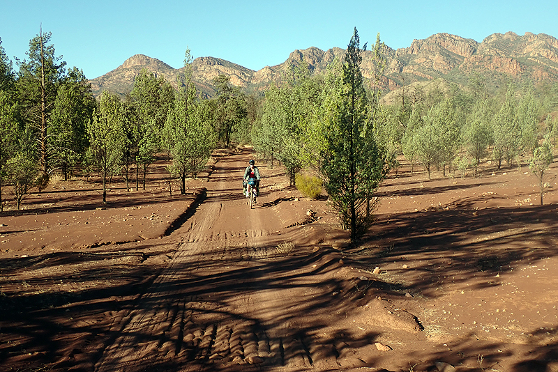 The track to Wilcolo Campground and beyond started just at Wilpena Pound Campsite and it was about an 8 km ride. Until we realised pretty quickly that for us it would be mostly unrideable. It was pretty technical in places, almost all single track with deep ruts and crossed any tiny pitched creek beds which were massively steep both down and up. Some sections had sharp shale embedded so that they stuck out for you to ride over. This kind of stuff can really take your tyres apart. I guess for mountain bikers that like to have a story to tell "How I blew two tyres in one day" it is part of the excitement, buy our tyres have a long way to carry us! We got to a part where we could not actually work out how to traverse this steep creek bed crossing and almost turned back. Eventuallly we got there, the route improved towards the end (which is a good thing as we have to get back onto it tomorrow). The campground is in a beautiful spot with great views of the mountainside and surrounded by fir trees. It is convenient to have a toilet and the water tank. They could perhaps have stretched the budget to a picnic table and benches. We spent the afternoon doing a bit of resting and recuperation and also some maintenance. Tomorrow we will call it a day on the Mawson Trail