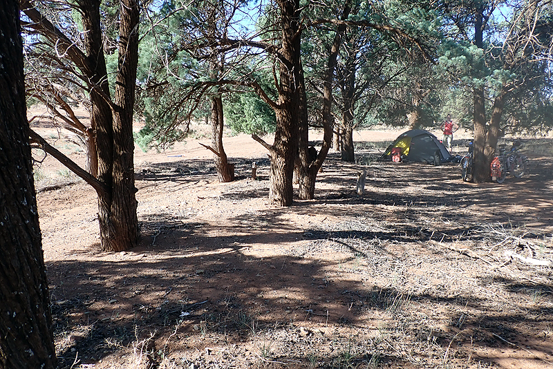 Turning off the park road onto bitumen (yay!) we had planned to ride about 8km or so to just after the park boundary and find a place to camp. We have decided to ride shorter days instead of taking a full rest day. There has not been a place really suitable for a whole day off and the weather is so good everyday that neither of us have woken up yet thinking we would rather have a break. That said, we have ridden 700 km without a day's break so will definitely have one by Maree. We find the time between 12:00 and 14:00 quite hot and it was great today when we crossed the park boundary to have another little shelter to sit under in the shade. There is always an afternoon breeze and if tyou sit in the shade it is pleasantly cool. Shortly after this we crossed another floodplain, the warning sign for this one said "Floodplain Next 7km" so that gives an idea of how flat it is! The landscape is dotted with these fir trees which are great for shade, and we left the road at a dry river bed and could pitch under the trees for a lazy afternoon.