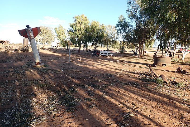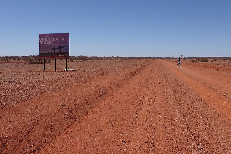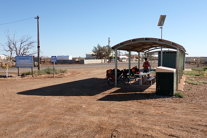 After our rest day yesterday, we were up at 05:15 and on the road by 06:45. It was a fabulous ride, all gently downhill and the road was quiet and, most importantly, sealed all the way. We were expecting it to be unsealed after Lyndhurst for a way. The area is very flat and amazingly barren. There are things to see though, mostly the ever-present old Ghan Railway. We are getting used to the sometimes lunar landscape. We stopped for coffee at Lynhurst ("population 30 (most days)" according to the sign). It is amazing what these small dots on a map provide; in this case clean public toilets and treated water in the tap. Some interesting information boards too about the Oodnadatta and Strzelecki Tracks. The road to Innaminka turned right - no services for 473km. The Oodnadatta was straight ahead.