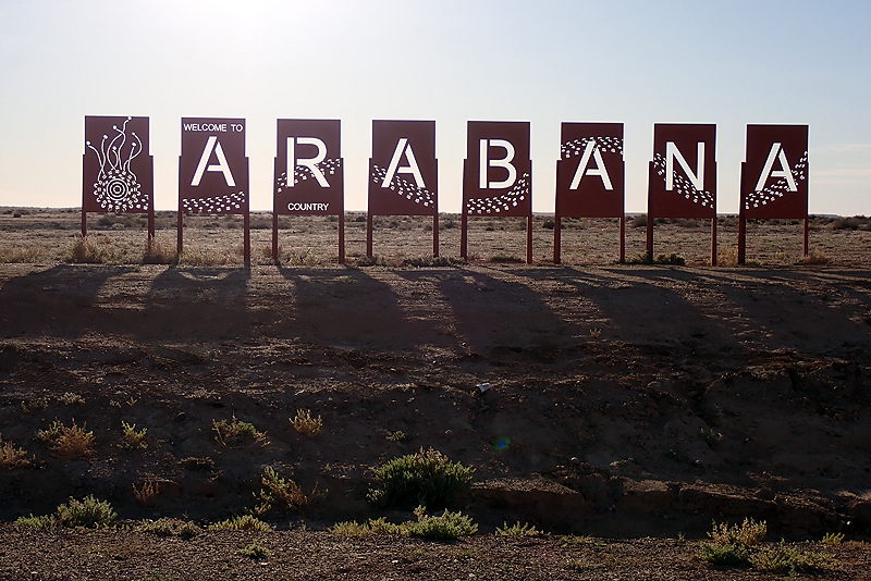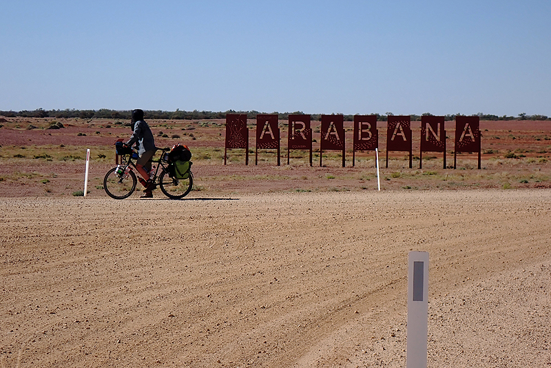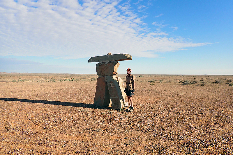We heard the sheep coming home during the night, bleating and bah-ing away as they came closer. Our bush camp was at a dried up waterhole, but it had obviously been full with the recent rains so it seemed to have resulted in millions of flies and also other bugs which were attracted to the tent when we had our headtorches on inside last night. The bugs in turn attracted a bird which flew back and forth just over the tent catching the bugs. Everything has got to eat. Except nothing seems to eat flies. We really appreciate the brilliant sunsets and sunrises out here and feel lucky that we will be seeing many. It is a highlight of each day. As we got on the bike to leave our bushcamp before 07:00, a family of emus poked their heads out of the waterhole and loped along towards us, obviously very interested and curious. They ran alongside us for a while. The road to Marree continued sealed, slightly downhill and lightly trafficed. We had a slight tailwind as well. We stopped at a few interesting things (see pics). One seemed to be an "Inukshuk" which we are used to seeing in Canada. I don't know if there is an Australian equivalent. It is meant to represent a man showing you the way. This one was big and his head had fallen off and lay on the ground behind him.