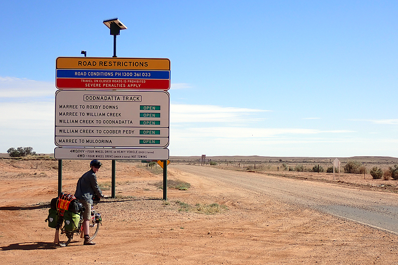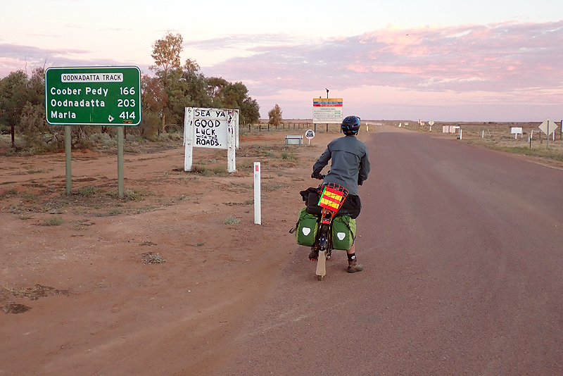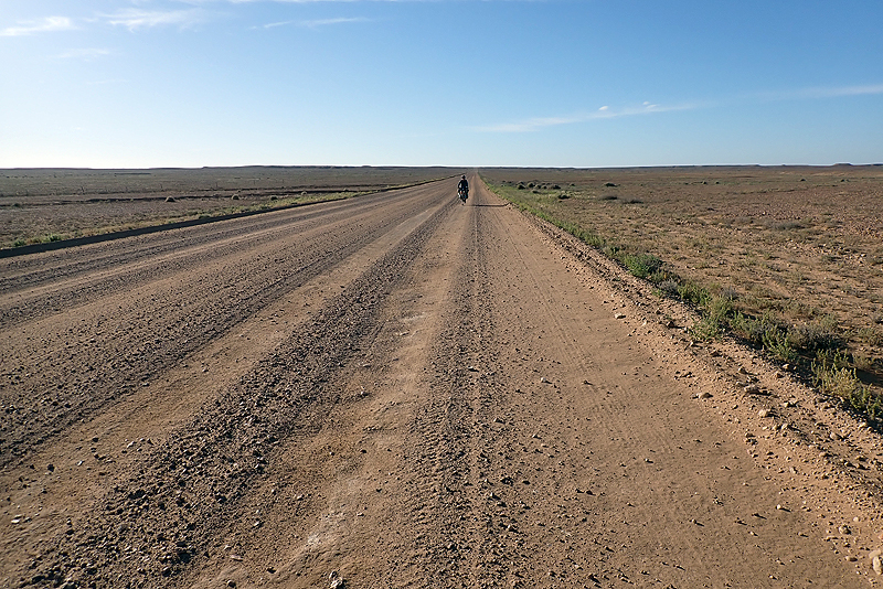 It is always strange being indoors, neither of us slept very well, not as much fresh air I guess, but so nice to have a rest from the outdoors. We woke around 05:00 and were both a little apprehensive about the day considering it was the first time we would need to carry water for three days. Throughout the trip the longest time from water point to water point would be two nights and three days, so we would leave water supply on the morning of day one and be at another water supply point on the night of the third day. We had done the calculations many times and tweeked the number according to our experience out here. We decided that 36 litres was the number. This meant carrying a water bag each in addition to our usual 23 litre maximum water total. Mike would carry a 10L bag and I would carry about 5 or 6L extra. The bags get strapped to the back of the bike. The campsite at William Creek had a desalination system in place to treat the borewater and so we did not have to do any further treatment. We wondered how we would go with the extra weight. We were already carrying a lot of extra food. We thought we might wobble out of the campground. We hoped the road was better.