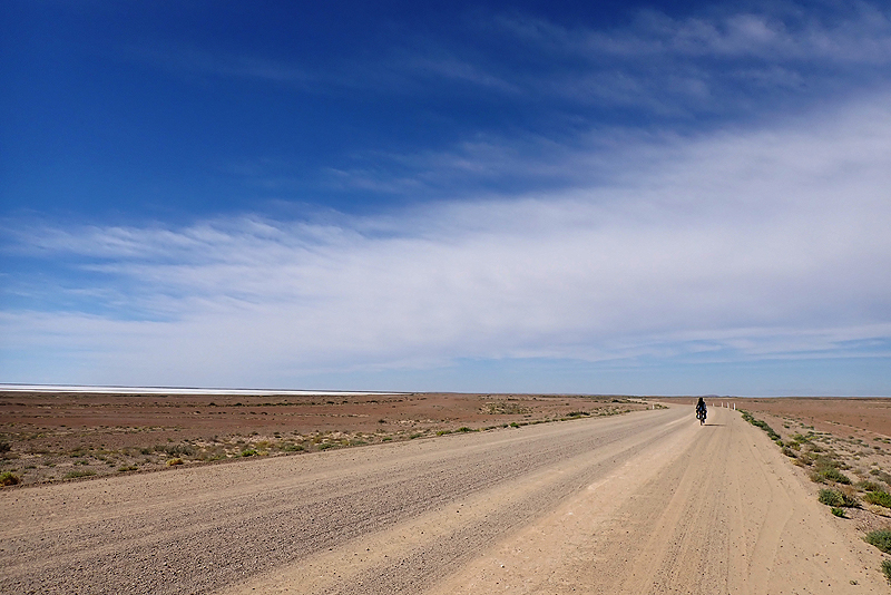 After lunch I cycled in my fly net as the flies had become ridiculous. It keeps them away, but also somehow hampers your vision and so that is a downside. Mike puts up with the flies as he prefers to see where he's going! That includes having flies trying to enter your brain via your ears, so I opted for the net for a while. It was great to see Lake Eyre and read about the Lake Eyre Basin and aquifer. This area is 12 m below sea level. We had not realised the size of the basin - it takes up 22% of Australia and the water stored under the ground is inexhaustable. Unless we wreck it somehow which is always a possibility. The lake itself is an amazing sight, as you draw near it you would reallly think it is water, although it is only salt. We passed a few spots today with ponds or waterpools; all salty. It is amazing though how quickly the reed beds and birds would have arrived with the recent rains.