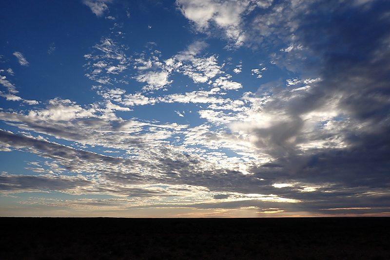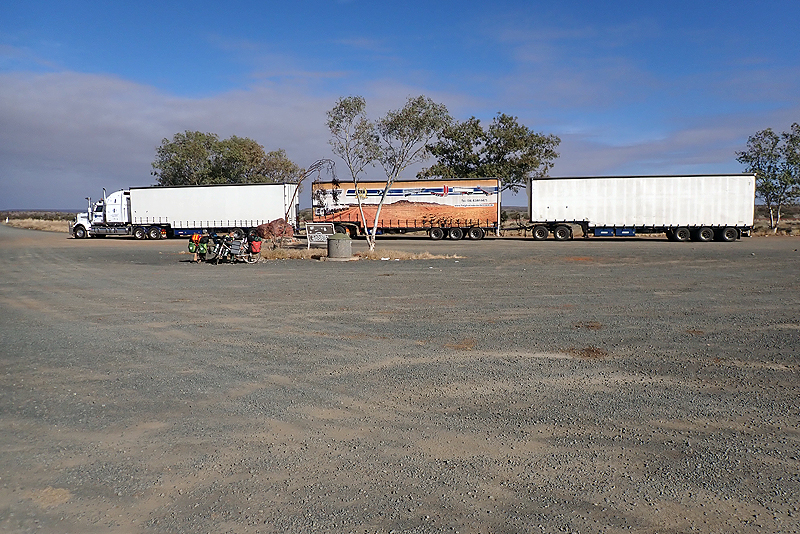 The wind blew hard all night and then we had some drops of rain. Also a few road trains rumbled passed during the night, which was reassuring as it seemed unlikely then that we would meet any during the day. When they come you hear a low rumble from ages away and you see a massive dust cloud lit up like a spaceship is landing and it just draws closer and closer, until it passes with all colours of lights beaming and the ground vibrating around it. As it was cloudy last night, it was so dark you could literally not see your hand in front of your face so the road trains passing had an even greater impact. We were pleased to wake to a favourable wind and a cooler day.