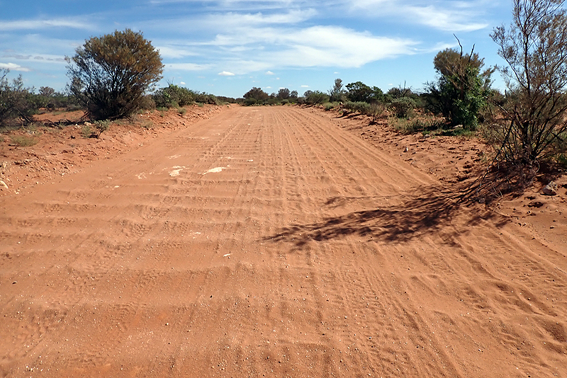 We set off with our 36 L of water, day one of our last three days on the Oodnadatta Track to Marla. The road condition sign as we left the bitumen showed the road open to 4WD only, no towing. The first 25 km sped by, great road, the beautiful morning dawning all around us. We had our coffee break at this point, one 4WD drove by in the direction of Marla and two farm utes came by in the opposite direction. These farm boys sure can drive this track! They race into view and disappear into a cloud of dust but stilll have time to give us a big grin and a wave. After this things just kind of deteriorated from here on out. The road conditions were horrendous. You would hit a good patch and then it just got more and more corrugated with soft edges that we could not ride on, so you were sort of left bouncing on the corrugations until your arse wore out or your bike broke in half. We stopped for lunch around 11:30 and three cars towing caravans sped by in the same direction as us so they must have decided the road was okay for towing. The road is dry, but there are massive ruts where vehicles have done severe damage when it was wet.
