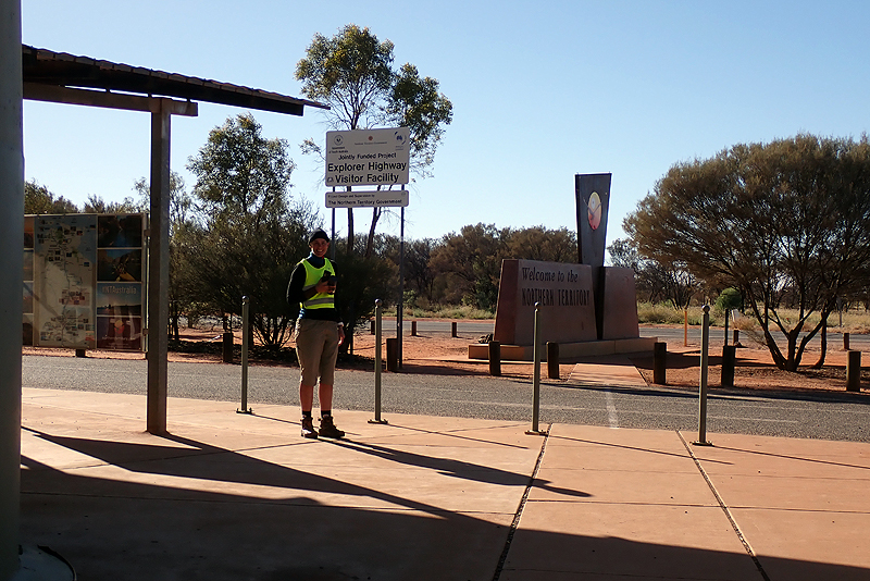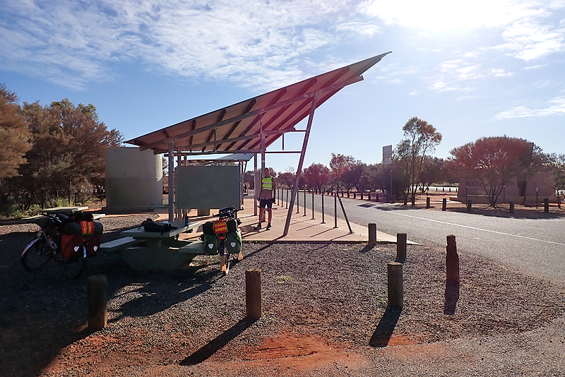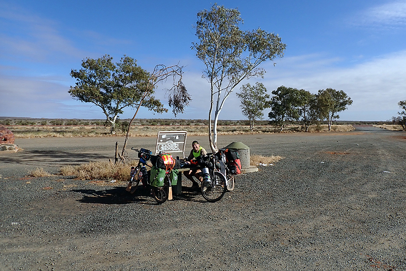 It was a cold morning at just over 1 degC as we hopped back onto the Stuart Highway. We had a stop after about 38 km at the SA/NT border which is quite a nice spot. There is a HUGE water tank with either very little water in it or they have set the tap to a unbearably low flow so that people don't take too much. We did not need any. You can camp overnight there and there is a toilet. We stopped again at Kulgera Roadhouse. They serve the usual hot meals and there is a pub but the shop had hardly anything to buy, just soft drinks and chocolates. We ate our usual lunch of wraps with Nutella or Biscoff spread at the picinc table outside. A few travellers spoke to us about our trip.