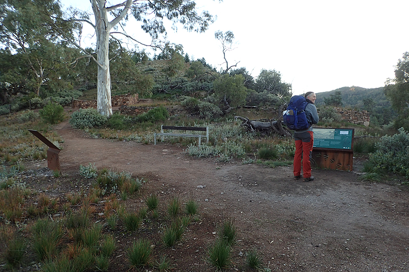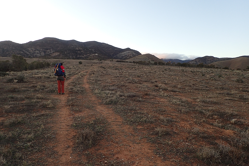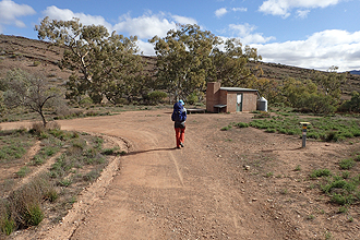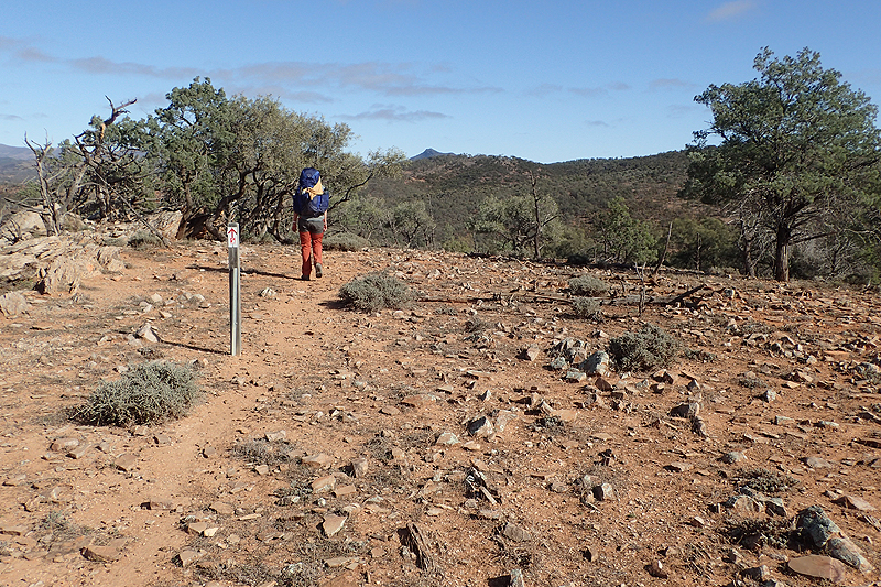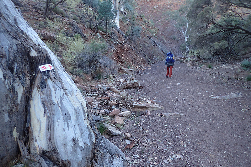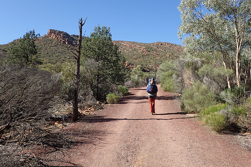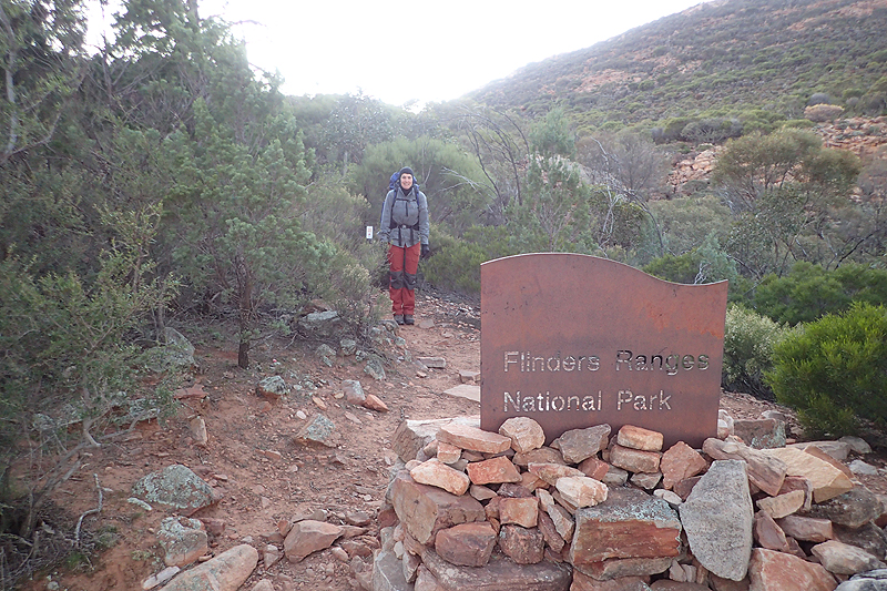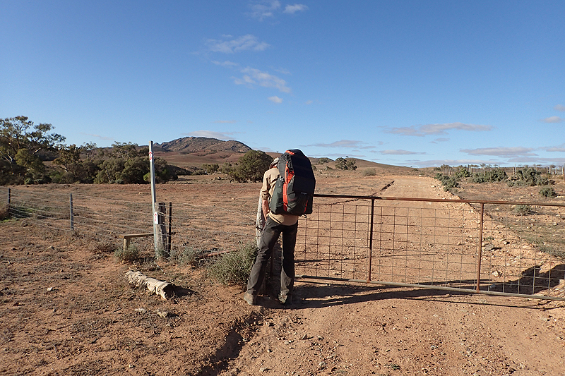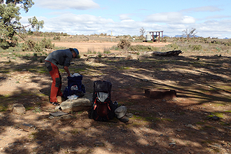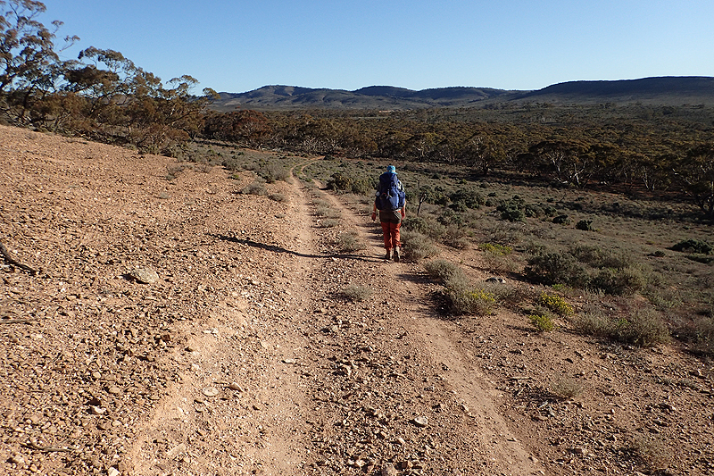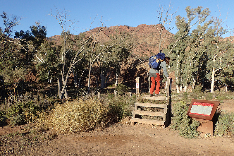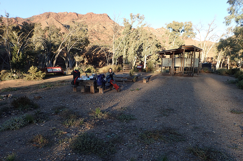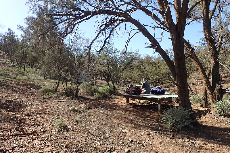 Mike wondered if we should try the stove again in the river bed, I said "No, let's wait for the trailhead". We had about 4km to walk to it. Last night had been such a debacle, it might take Mike the rest of the trip to get rid of the ingrained soot on his hands! We packed up and set off. Beautiful morning, quite warm. We sat down at the bench at the trailhead and got some water from the huge tank. This hike will really be all about going tank to tank! We had stopped off here last year and sat at the same table. We had only then realised that there was a thruhike here and thought you would have to be crazy to walk it. There was a parked car and later two girls pulled up in another car having walked from Wilpena to here. Mike had now given the new stove a full service, flushed out the tube that connects stove to fuel bottle, and we crossed our fingers. Bravo! It worked! A littled begrudgingly but we had hot oats and tea and coffee so we will forgive it. We did not know it then, but the stove operation was just to improve by small increments over the next few days and we ultimately went from "We are going to throw you from great height" to arriving at Cape Jervis 7 weeks later still friends. "You have to know how your equipment works in order to maintain it in the field" is the lesson here for everyone. Or "Thank heavens one of us is an engineer"!