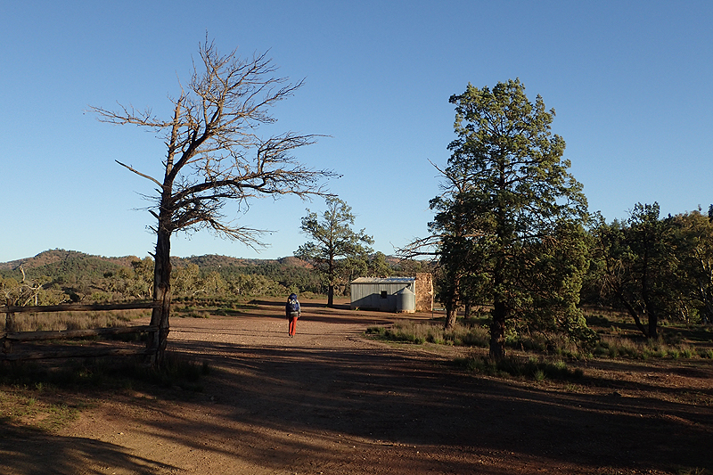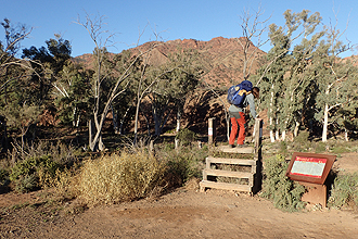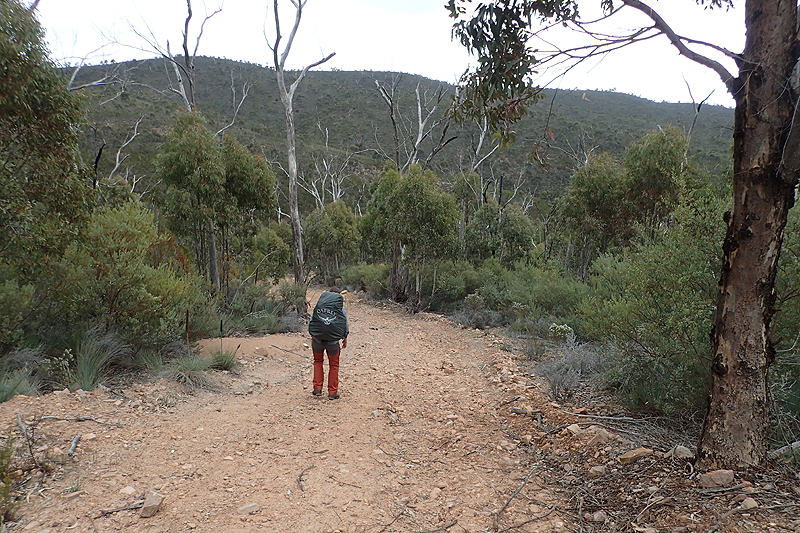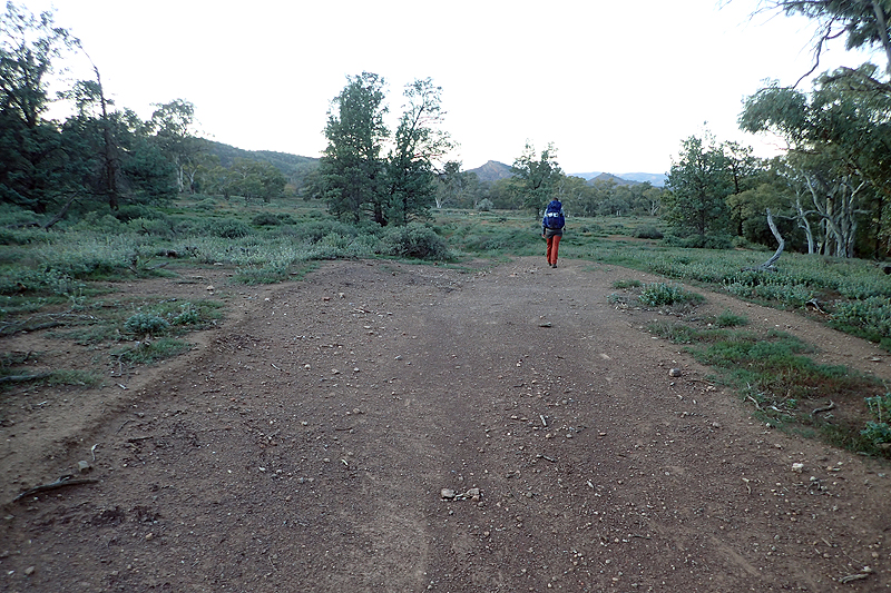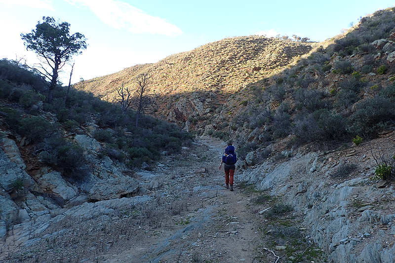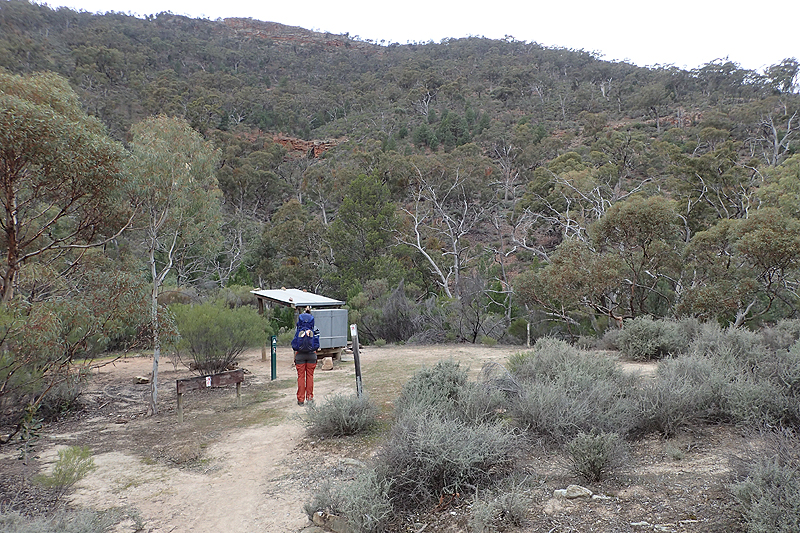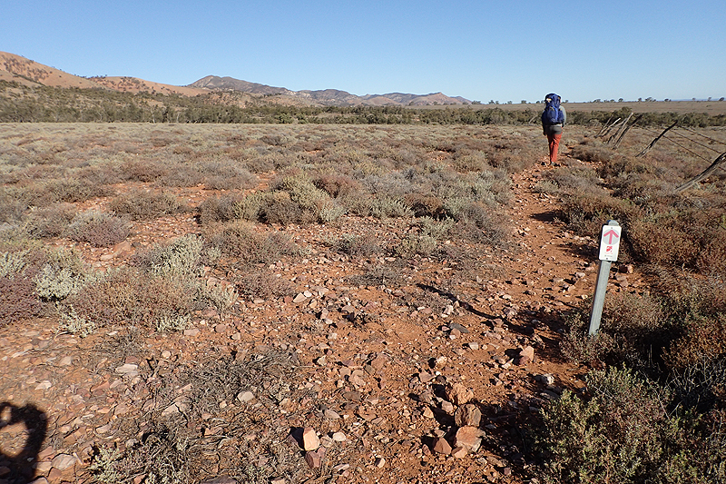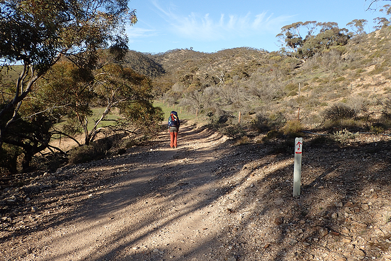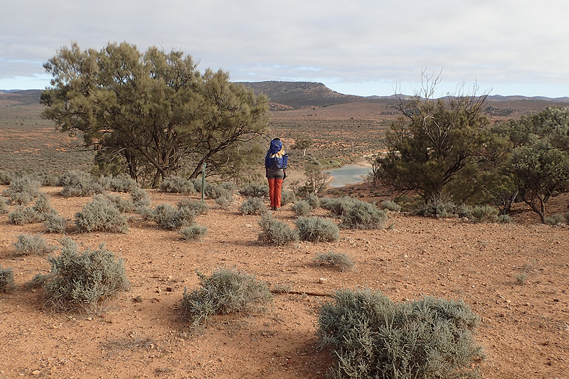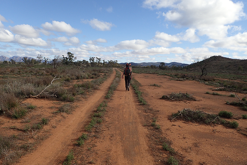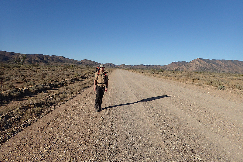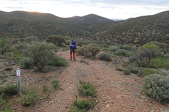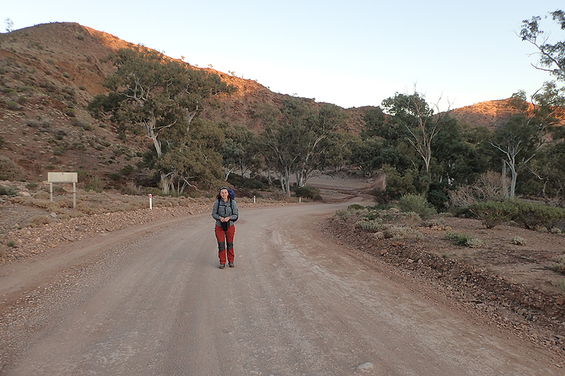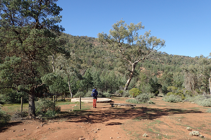 Mike wondered if we should try the stove again in the river bed, I said "No, let's wait for the trailhead". We had about 4km to walk to it. Last night had been such a debacle, it might take Mike the rest of the trip to get rid of the ingrained soot on his hands! We packed up and set off. Beautiful morning, quite warm. We sat down at the bench at the trailhead and got some water from the huge tank. This hike will really be all about going tank to tank! We had stopped off here last year and sat at the same table. We had only then realised that there was a thruhike here and thought you would have to be crazy to walk it. There was a parked car and later two girls pulled up in another car having walked from Wilpena to here. Mike had now given the new stove a full service, flushed out the tube that connects stove to fuel bottle, and we crossed our fingers. Bravo! It worked! A littled begrudgingly but we had hot oats and tea and coffee so we will forgive it. We did not know it then, but the stove operation was just to improve by small increments over the next few days and we ultimately went from "We are going to throw you from great height" to arriving at Cape Jervis 7 weeks later still friends. "You have to know how your equipment works in order to maintain it in the field" is the lesson here for everyone. Or "Thank heavens one of us is an engineer"!
