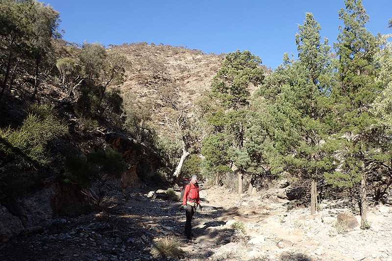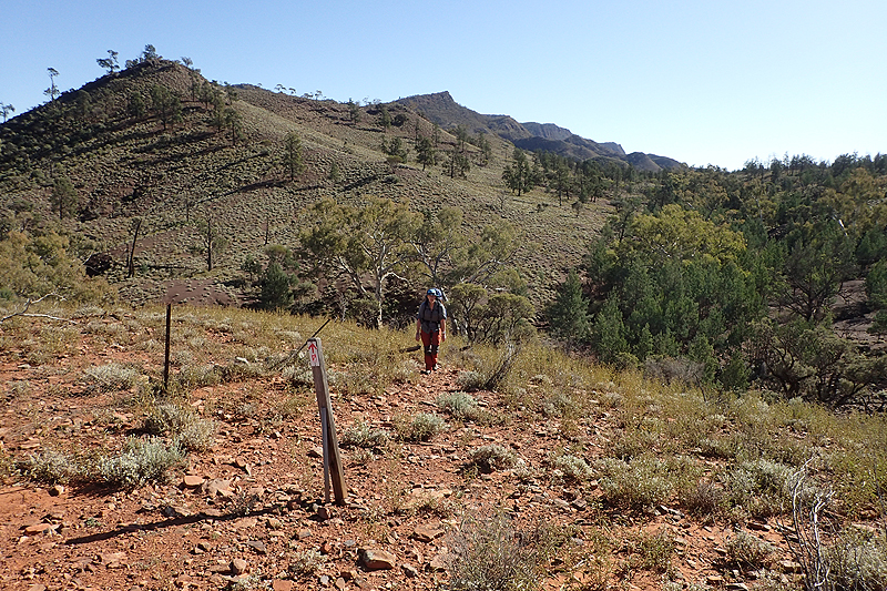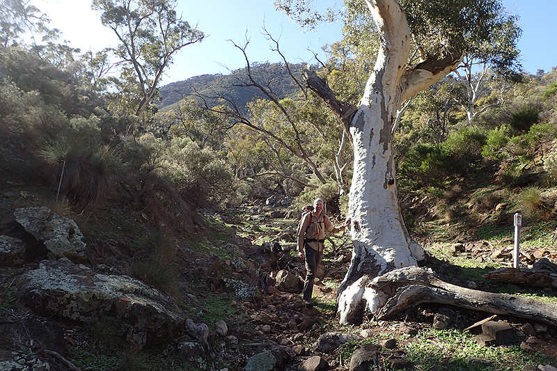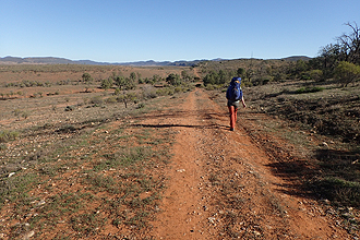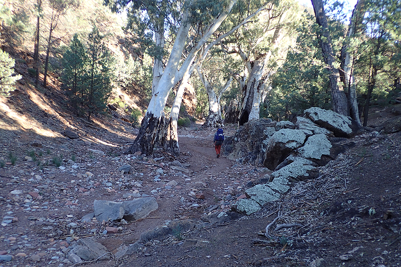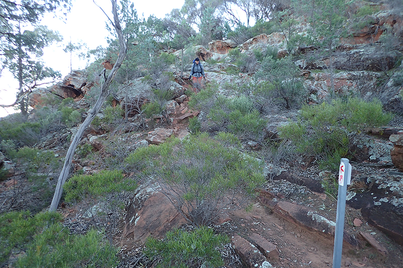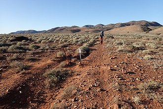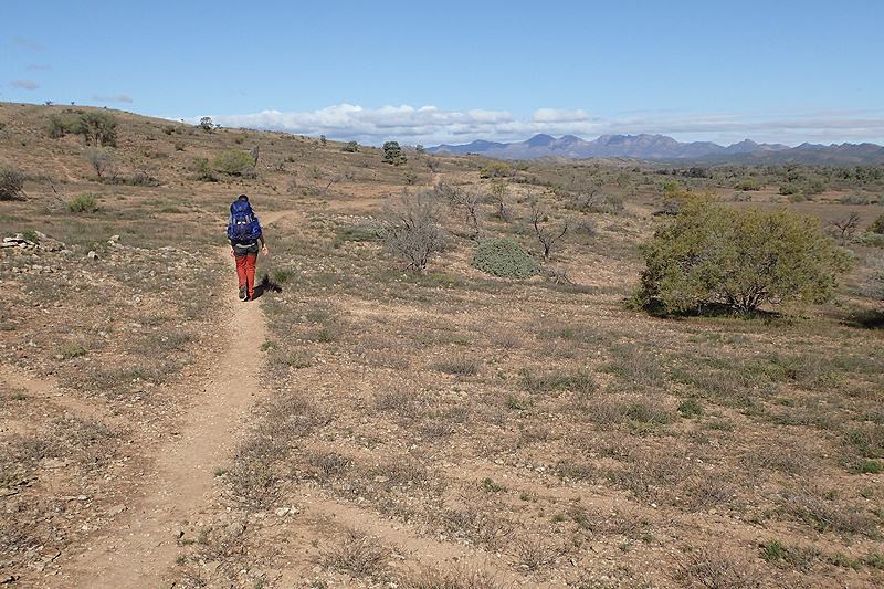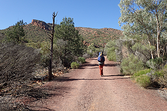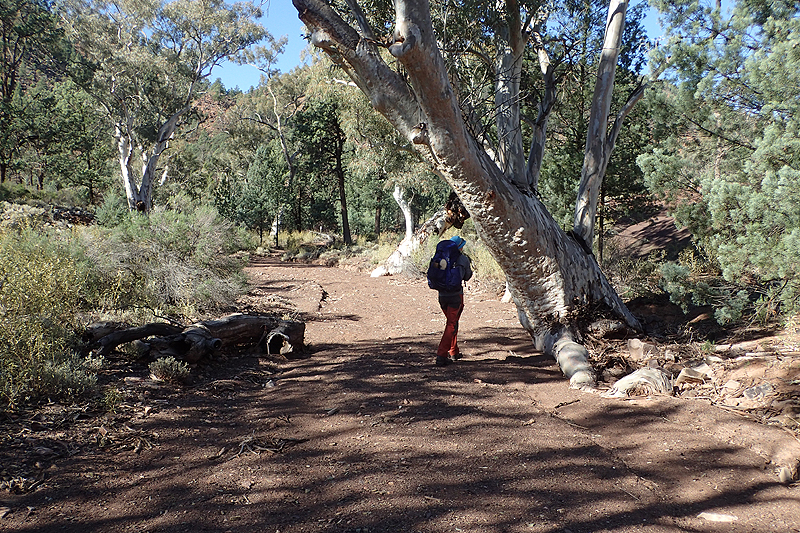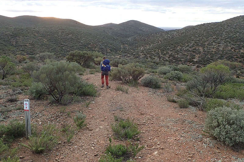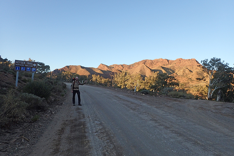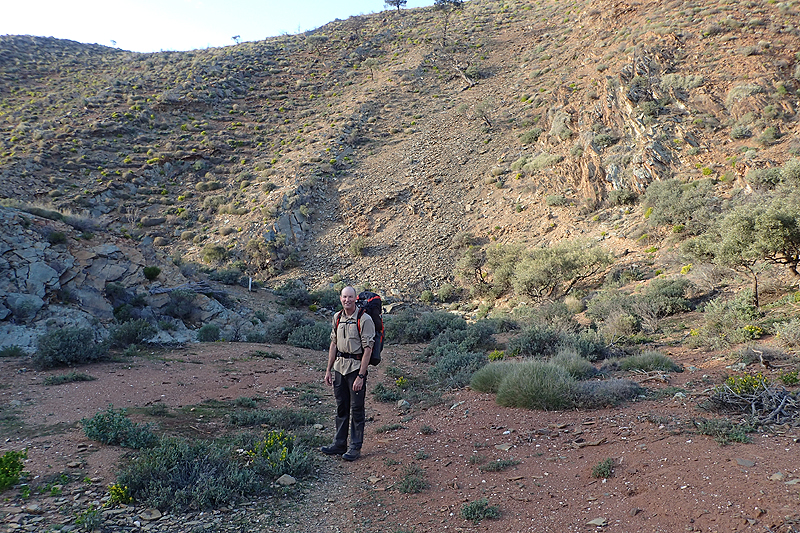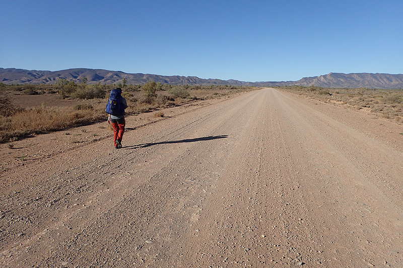 Mike wondered if we should try the stove again in the river bed, I said "No, let's wait for the trailhead". We had about 4km to walk to it. Last night had been such a debacle, it might take Mike the rest of the trip to get rid of the ingrained soot on his hands! We packed up and set off. Beautiful morning, quite warm. We sat down at the bench at the trailhead and got some water from the huge tank. This hike will really be all about going tank to tank! We had stopped off here last year and sat at the same table. We had only then realised that there was a thruhike here and thought you would have to be crazy to walk it. There was a parked car and later two girls pulled up in another car having walked from Wilpena to here. Mike had now given the new stove a full service, flushed out the tube that connects stove to fuel bottle, and we crossed our fingers. Bravo! It worked! A littled begrudgingly but we had hot oats and tea and coffee so we will forgive it. We did not know it then, but the stove operation was just to improve by small increments over the next few days and we ultimately went from "We are going to throw you from great height" to arriving at Cape Jervis 7 weeks later still friends. "You have to know how your equipment works in order to maintain it in the field" is the lesson here for everyone. Or "Thank heavens one of us is an engineer"!