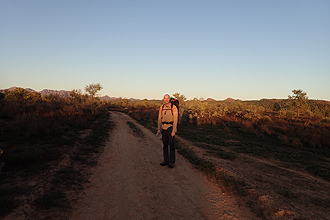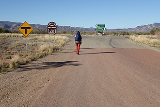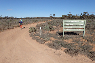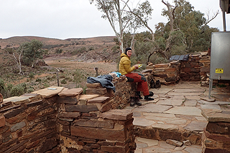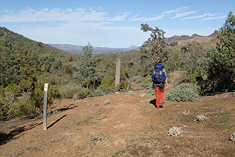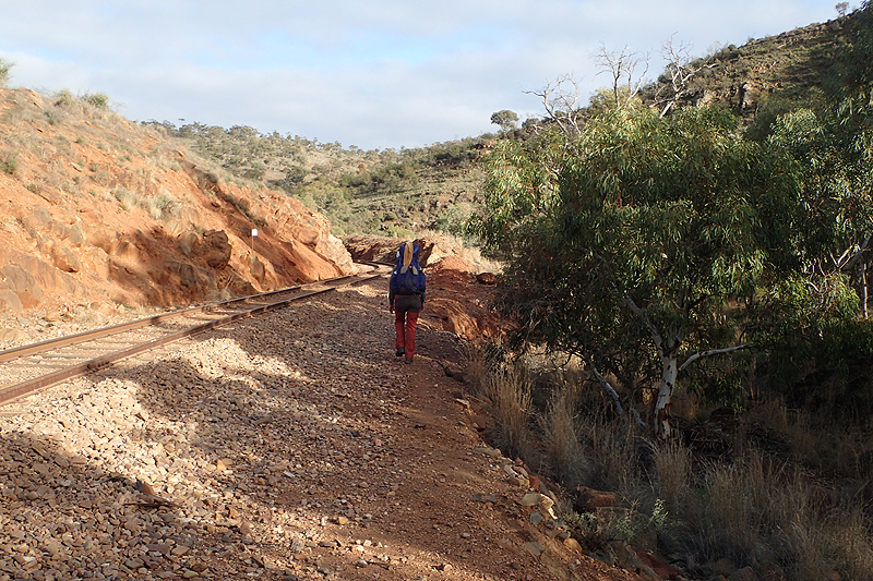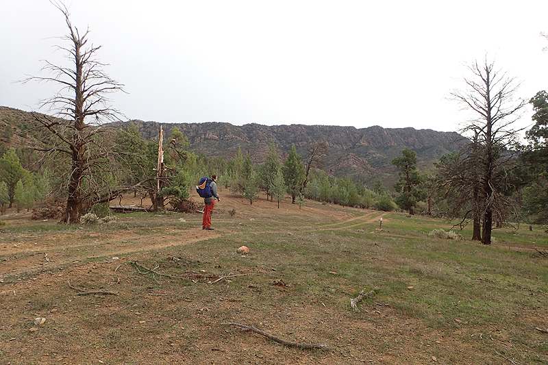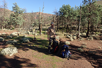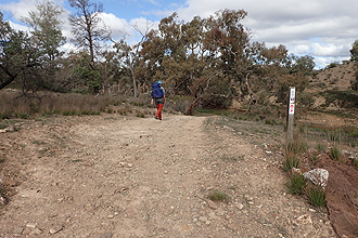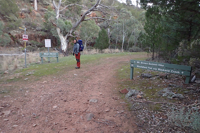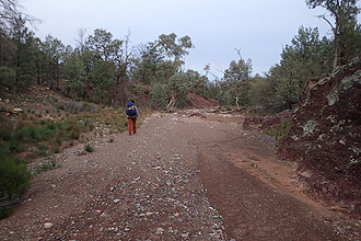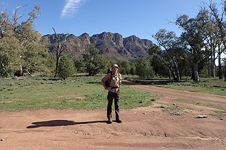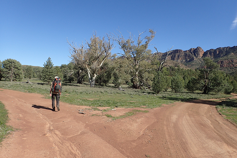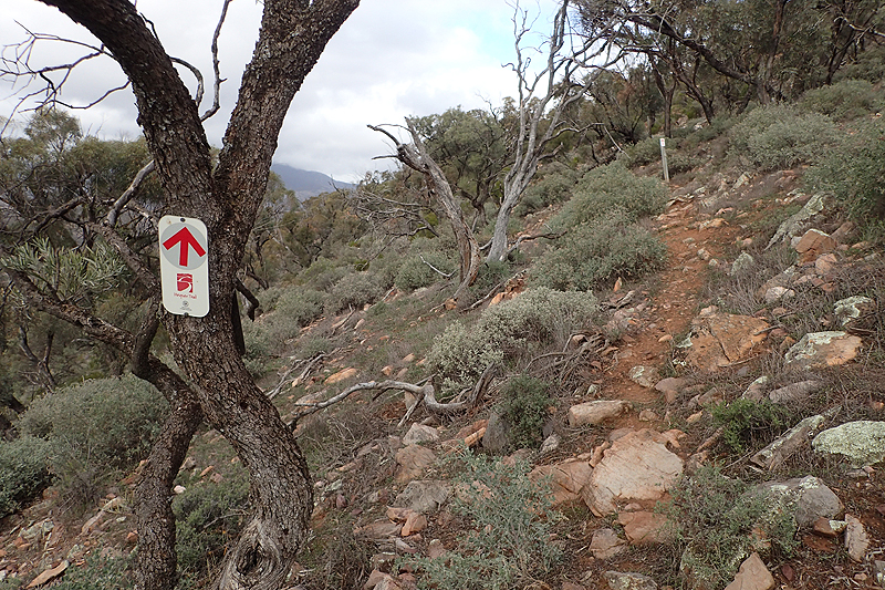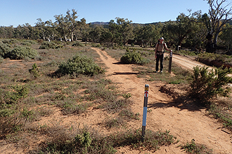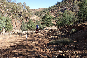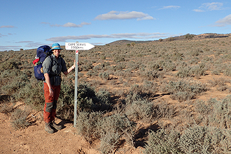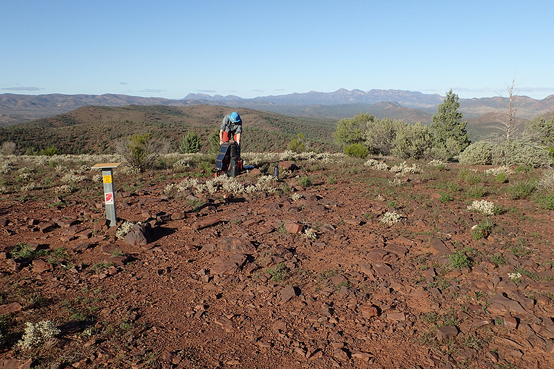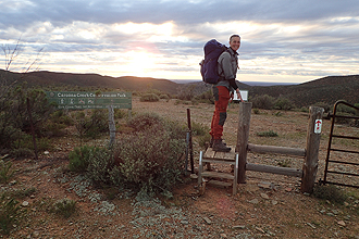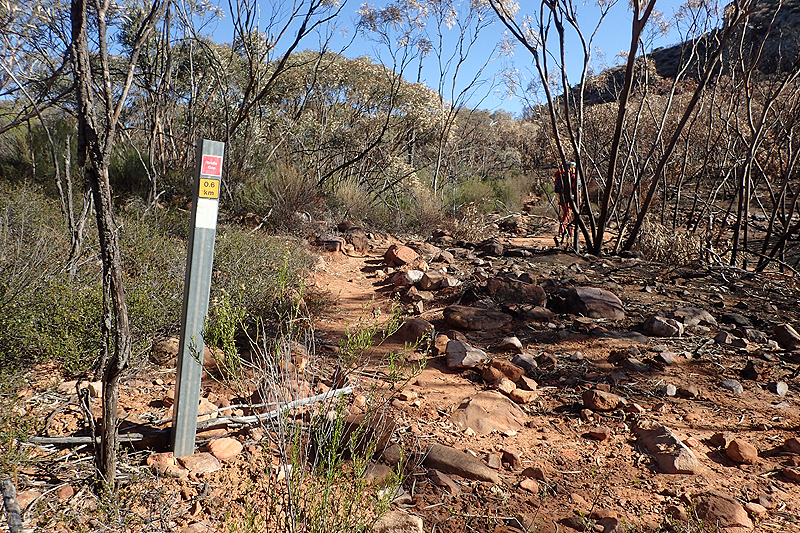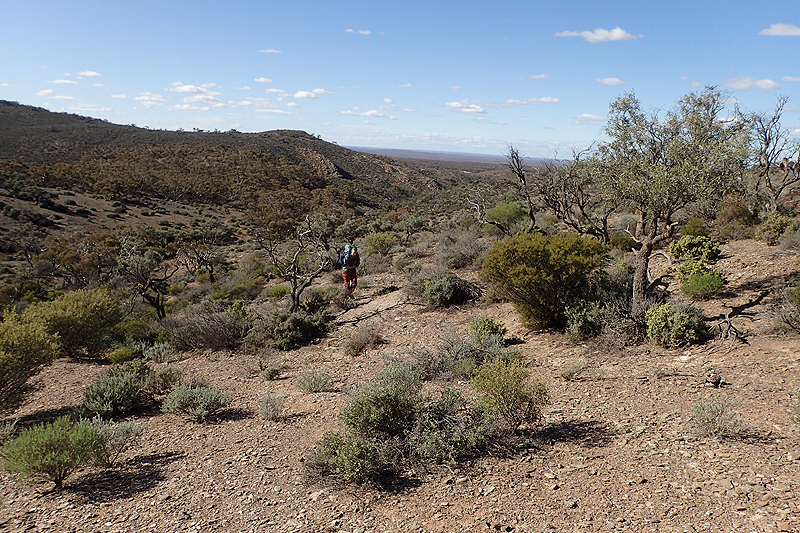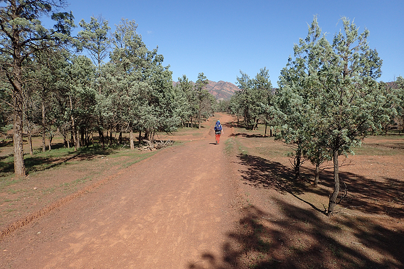 Mike wondered if we should try the stove again in the river bed, I said "No, let's wait for the trailhead". We had about 4km to walk to it. Last night had been such a debacle, it might take Mike the rest of the trip to get rid of the ingrained soot on his hands! We packed up and set off. Beautiful morning, quite warm. We sat down at the bench at the trailhead and got some water from the huge tank. This hike will really be all about going tank to tank! We had stopped off here last year and sat at the same table. We had only then realised that there was a thruhike here and thought you would have to be crazy to walk it. There was a parked car and later two girls pulled up in another car having walked from Wilpena to here. Mike had now given the new stove a full service, flushed out the tube that connects stove to fuel bottle, and we crossed our fingers. Bravo! It worked! A littled begrudgingly but we had hot oats and tea and coffee so we will forgive it. We did not know it then, but the stove operation was just to improve by small increments over the next few days and we ultimately went from "We are going to throw you from great height" to arriving at Cape Jervis 7 weeks later still friends. "You have to know how your equipment works in order to maintain it in the field" is the lesson here for everyone. Or "Thank heavens one of us is an engineer"!