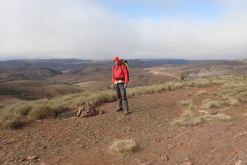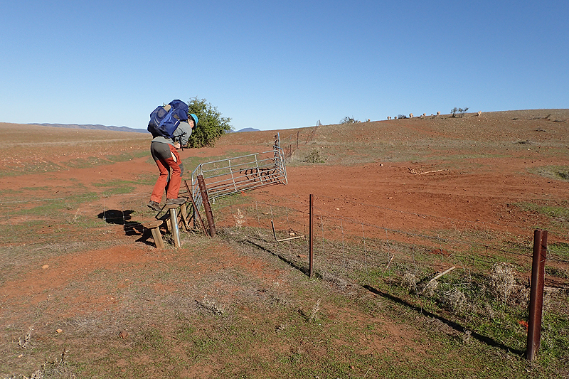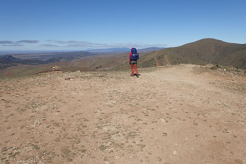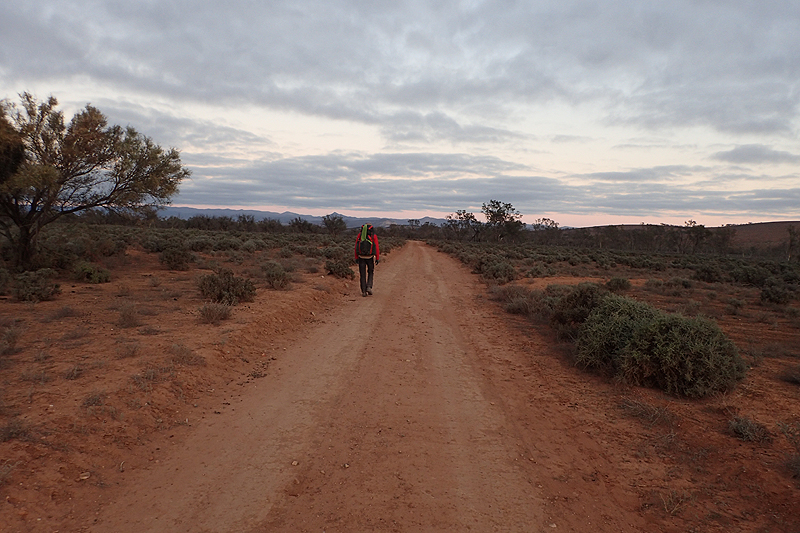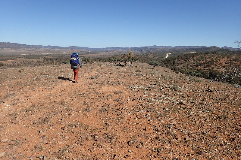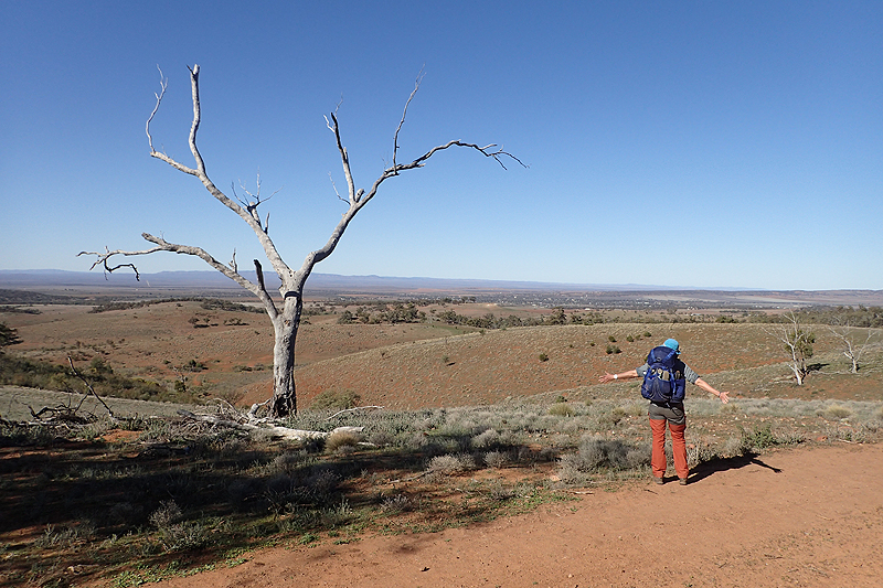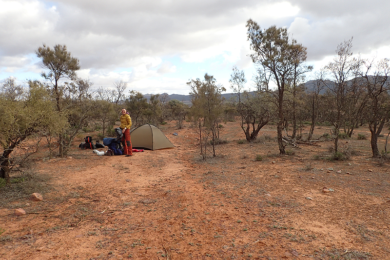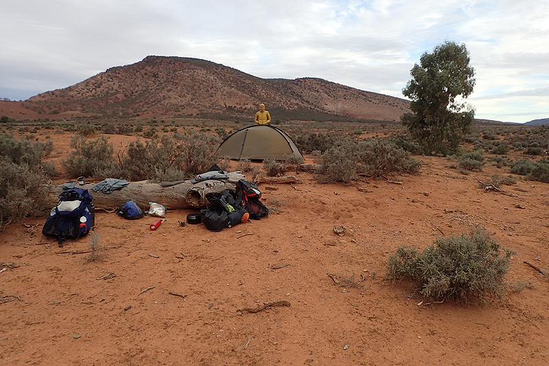 First frosty morning! The night was clear with every star twinkling. The tent was covered in thickish ice in the morning. We were Hawker-bound today to pick up a food parcel, do some food shopping and eat some food! As is often the case going into a town, there was a lot of road walking, both track and bitumen. There is the option of bypassing Hawker and heading for the ridgeline that we would meet up with later in the day, but we needed supplies. We spent a bit of time in Hawker and then headed off, up the climb to Jarvis Hill lookout. We had heavy packs from Hawker for the first time on the hike with supplies to last til Quorn, plus water for tonight and tomorrow morning. Carrying the water even 3 km on top of the food feels like you have had a bit of a kick up the arse. We saw farming for the first time walking from Hawker, sheep farming with very grubby looking sheep that might have to eat stones from the looks of things. Quite difficult to find a campspot due to thorns. Mike brought his usual Thermarest Prolite mattress, however, as we had been given a free Nemo mattress as a peace offering from Nemo (after they had already given us a full refund) due to the mattresses we bought failing so dismally on the Bibbulmen, I was using that for this hike. I was fully prepared for it to fail at some point. So I was looking after it very carefully. Hence the concern over thorns.