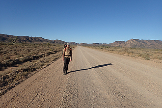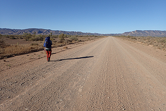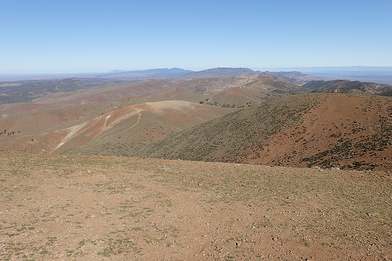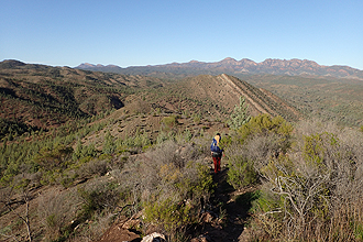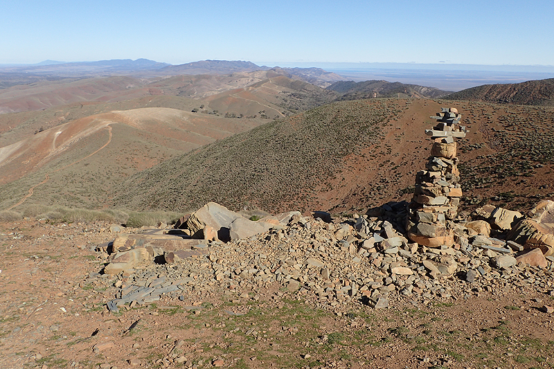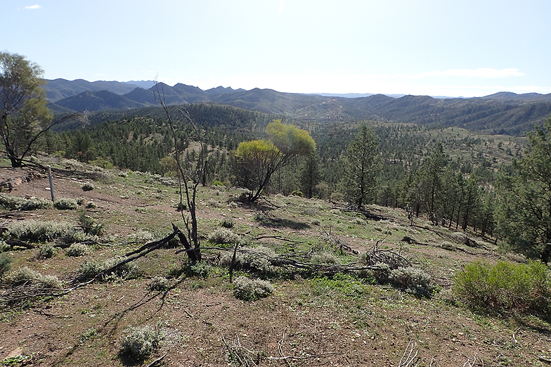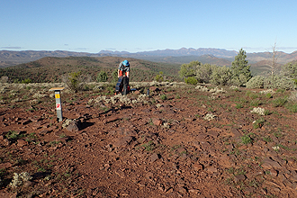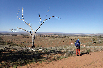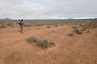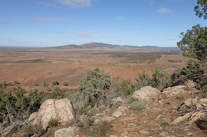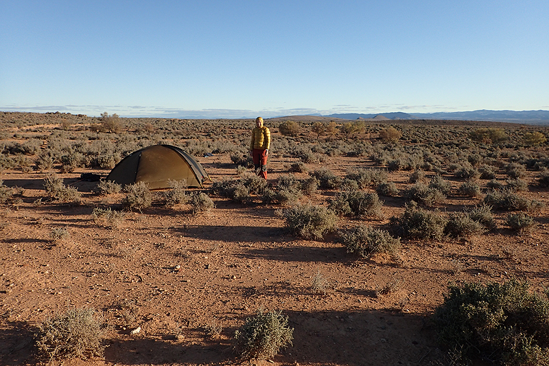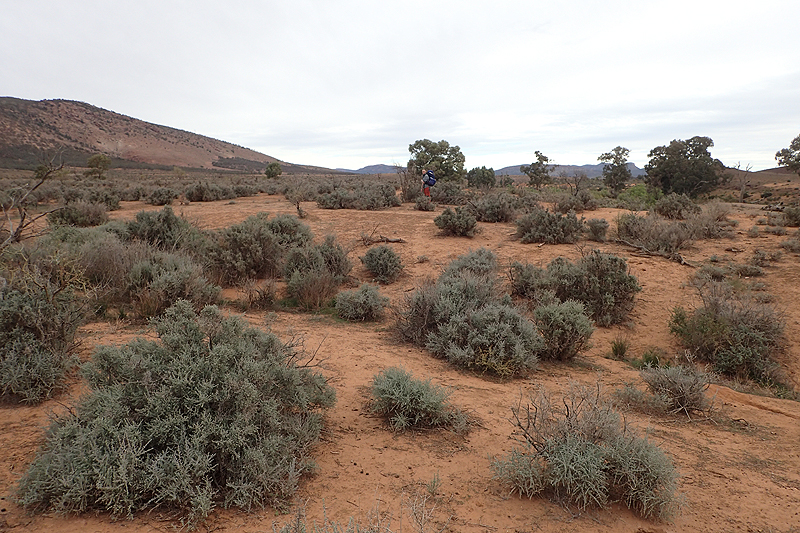 First frosty morning! The night was clear with every star twinkling. The tent was covered in thickish ice in the morning. We were Hawker-bound today to pick up a food parcel, do some food shopping and eat some food! As is often the case going into a town, there was a lot of road walking, both track and bitumen. There is the option of bypassing Hawker and heading for the ridgeline that we would meet up with later in the day, but we needed supplies. We spent a bit of time in Hawker and then headed off, up the climb to Jarvis Hill lookout. We had heavy packs from Hawker for the first time on the hike with supplies to last til Quorn, plus water for tonight and tomorrow morning. Carrying the water even 3 km on top of the food feels like you have had a bit of a kick up the arse. We saw farming for the first time walking from Hawker, sheep farming with very grubby looking sheep that might have to eat stones from the looks of things. Quite difficult to find a campspot due to thorns. Mike brought his usual Thermarest Prolite mattress, however, as we had been given a free Nemo mattress as a peace offering from Nemo (after they had already given us a full refund) due to the mattresses we bought failing so dismally on the Bibbulmen, I was using that for this hike. I was fully prepared for it to fail at some point. So I was looking after it very carefully. Hence the concern over thorns.